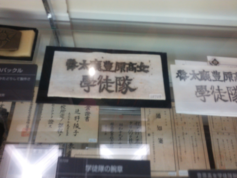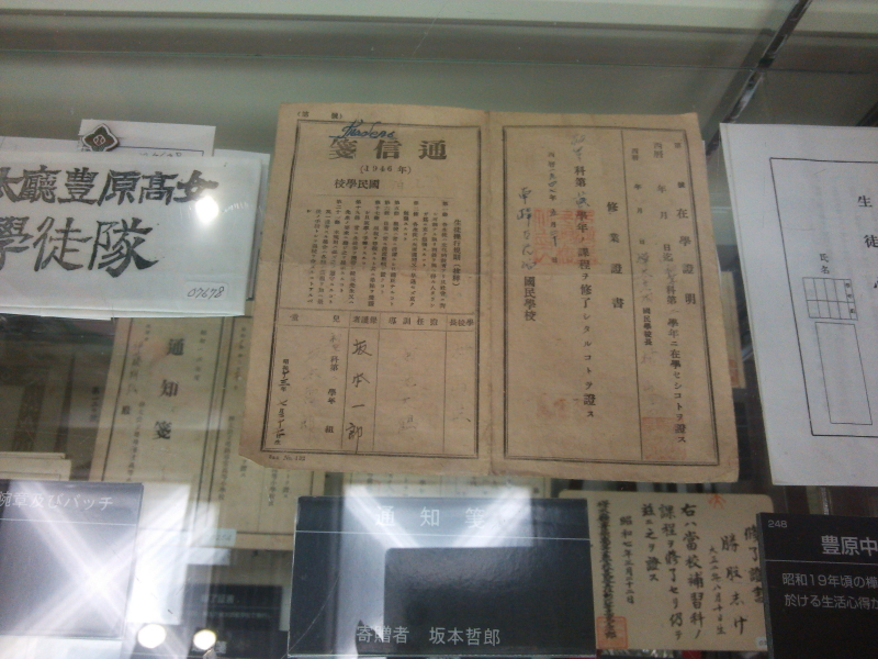 | 樺太廳豊原女學徒隊や豊原中学の修業証書、通知箋、バックル、紋章及びバッチ等。始政三十周年記念を伝える新聞、弥満小学校運動会(昭和10年東湾内)。 |