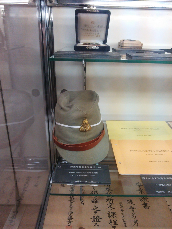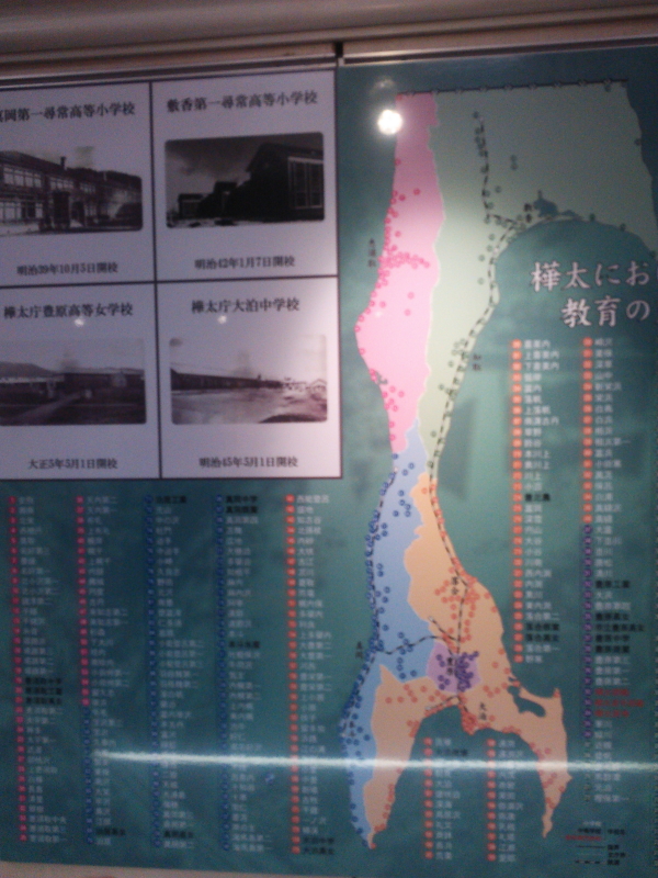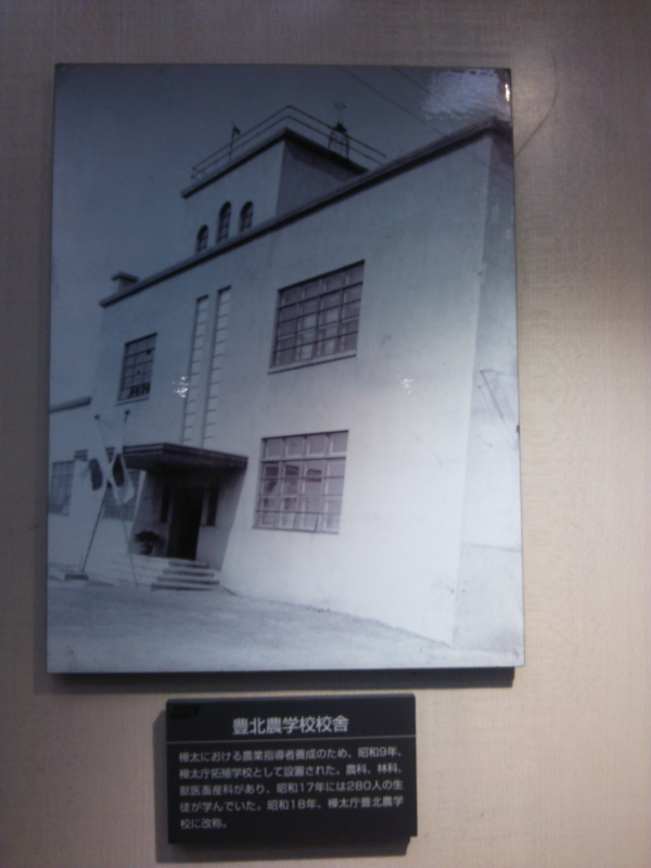 | 樺太庁豊原高等女学校(昭和2年代)、豊原中学校(大正14年開校)、師範学校(昭和14年開校)、医学専門学校(昭和18年開校)、学校群には、真岡第一尋常高等小学校(明治39年10月3日開校)、敷香第一尋常高等小学校(明治42年1月7日開校)、豊原高等女学校(大正3年5月1日開校)、大泊中学校(明治45年5月11日開校)、展示場には国境石の碑拓掛け軸も見られた。 |
