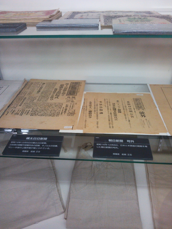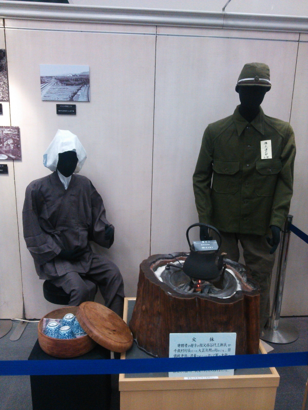 | 柴金物店の仕事着・黒いボーラーハット(山高帽)・前掛け、婦人の角巻・雪下駄・防空頭巾姿が展示されていた。ソ連軍侵略の被害状況を地図で示していた。 |