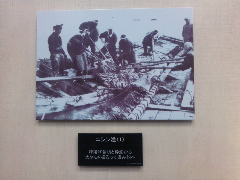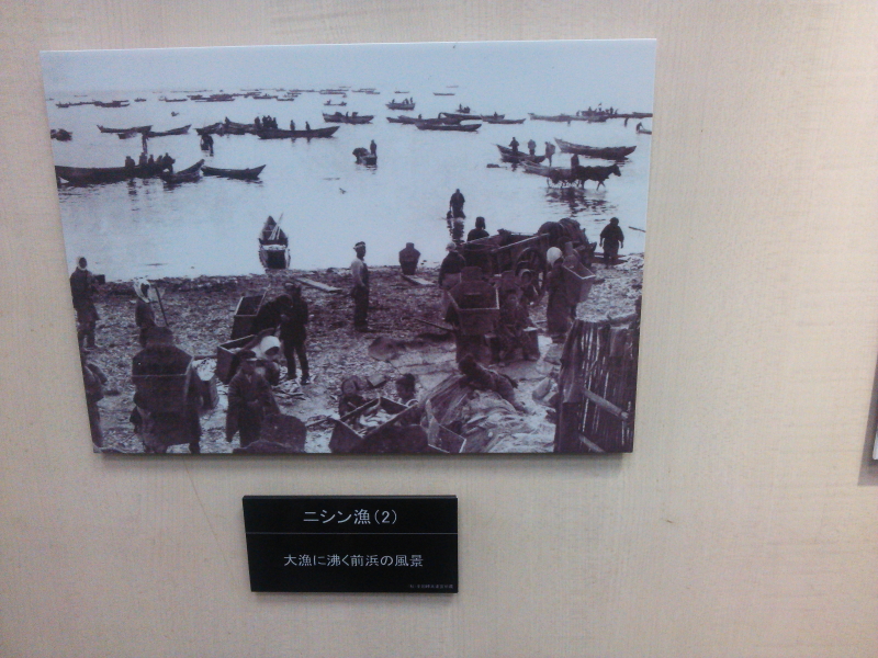 | 松川弁之助掘割跡も昭和9年に史跡に指定されていたようだ。火鉢、鉄瓶、湯呑と服装が展示されていた。ニシン漁(1)では枠船から汲み船へ、。ニシン漁(2)は前浜の風景写真。 |