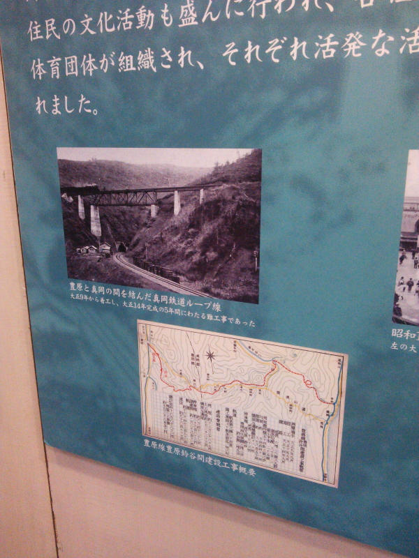 | 我が町、我が村のパネルには、樺太の生活と文化と題して、博物館、和取町と初音町間の舗装道路完成の祝い、昭和10年代の豊原駅前の賑わい、島の玄関口として栄えた大泊市街、豊原と眞岡を結んだ鉄道豊眞線のループ線や難工事の地図等を解説していた。 |
