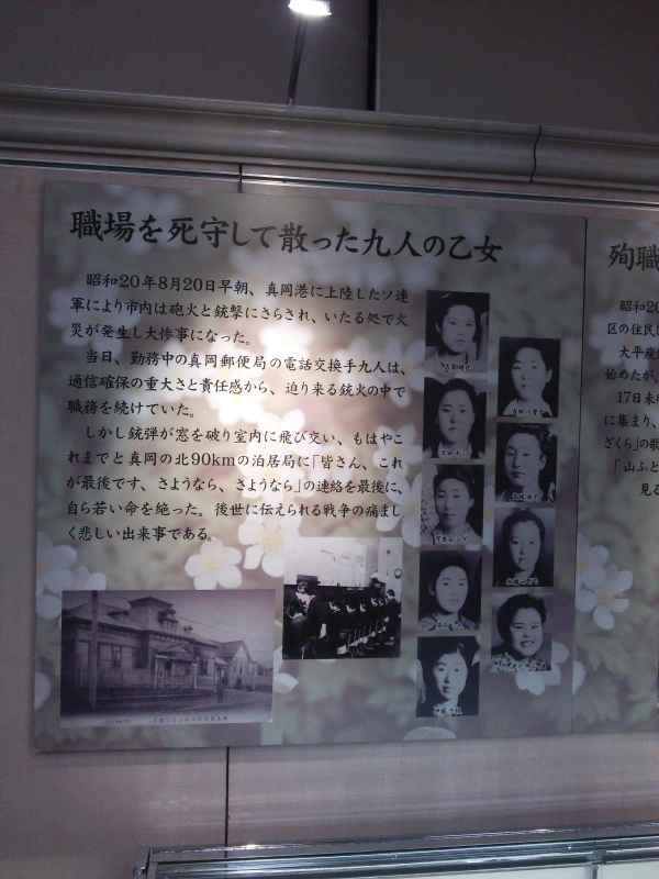 | 眞岡郵便局の九人の電話交換手、大平炭鉱看護婦、樺太に留まった人々のパネルがあった。その中で看護婦さんが歌ったというやまざくらの歌「山ふところの山桜 、一人匂える朝日かげ、見る人なしに今日もまた、明日や散りなんたそがれに・・・」とあるが、この歌は残念ながら現在のネットではヒットしない。どんな曲の歌だったのかと思いを巡らす。 |