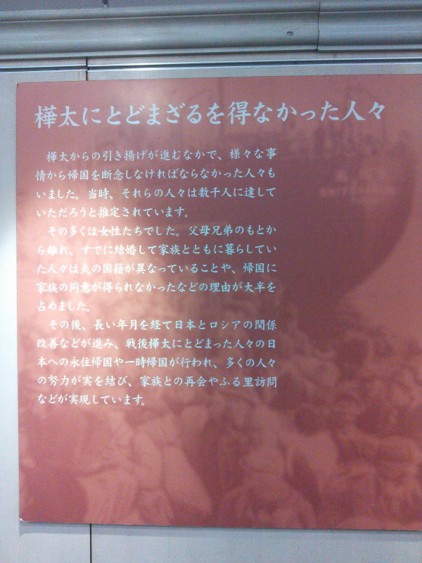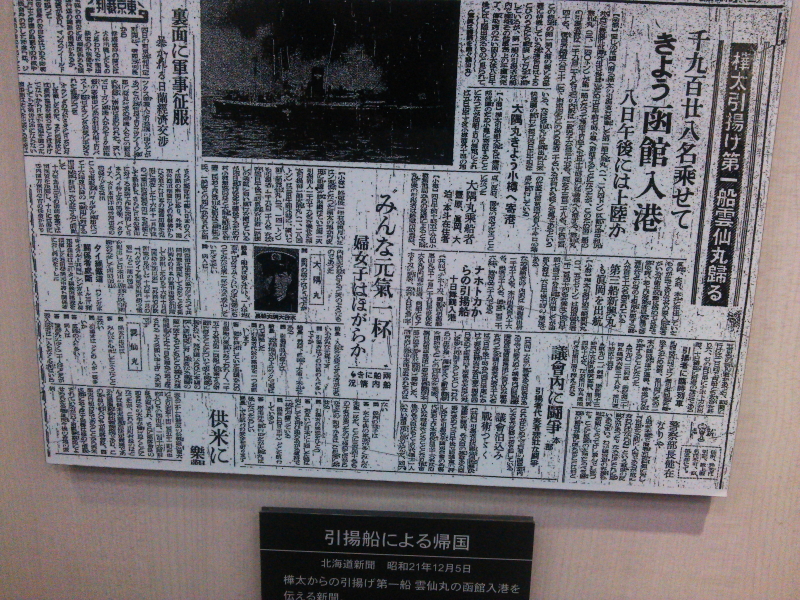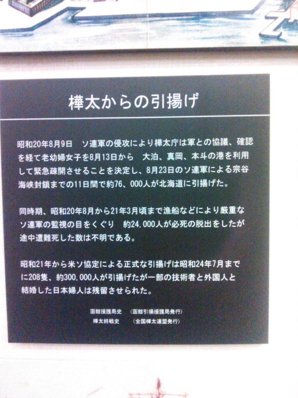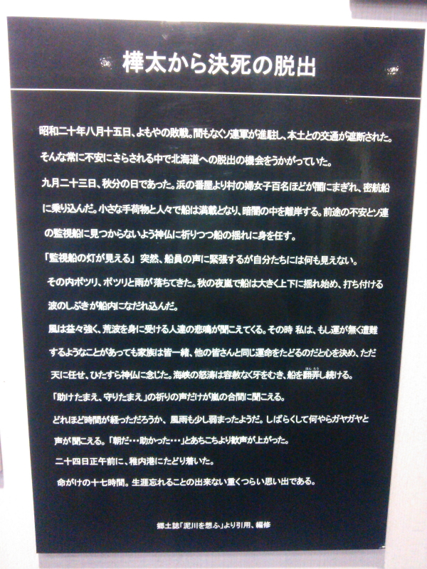 | 樺太からの引き揚げ、決死の脱出、函館港に着いた徳寿丸、帰国の喜び等のパネルもあった。 |