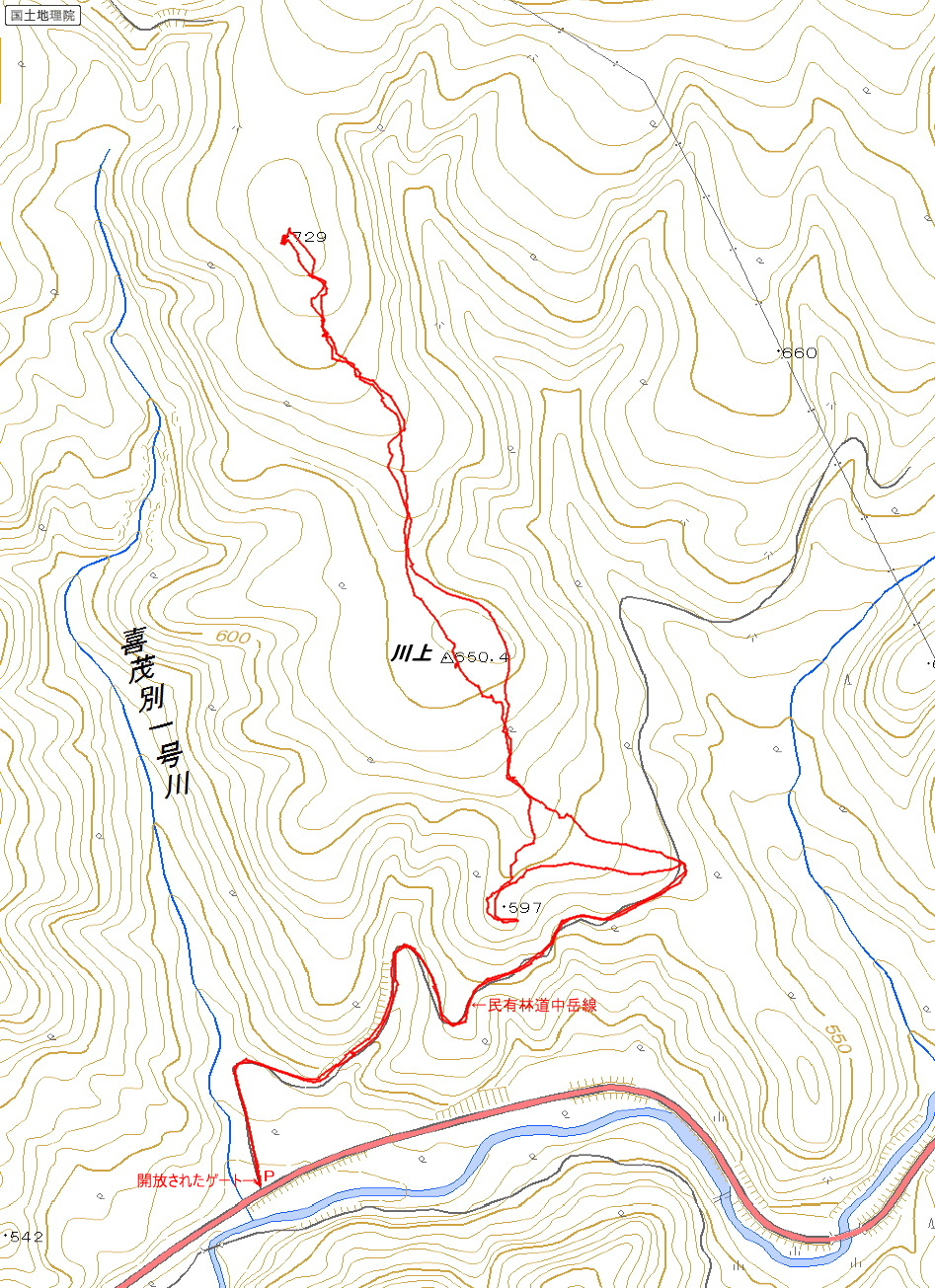 | 喜茂別1号川729m峰 三角点:川上(650.4m) |