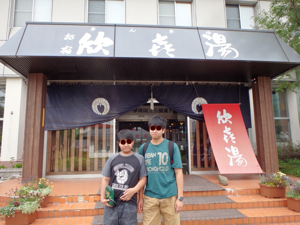 | 硫黄山の標識で記念写真を写し、ホテルへ向かう。温泉は釘を融かす位の強酸性なので、地下で硫黄山と繋がっているのだろうか。次の日、欣喜湯の前で記念写真を写す。欣喜湯の喜は七を三つ積み上げたような異体字(いたいじ)。 |