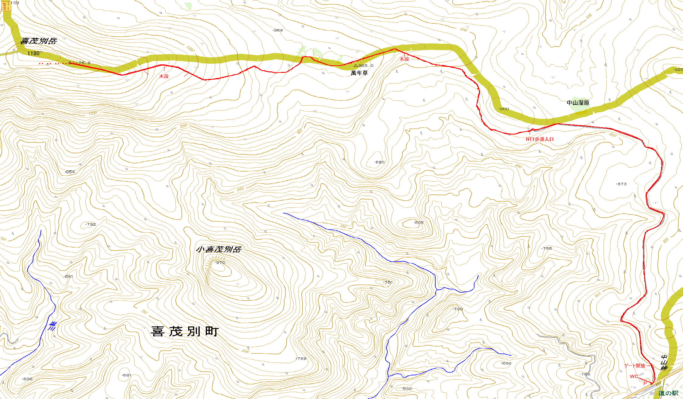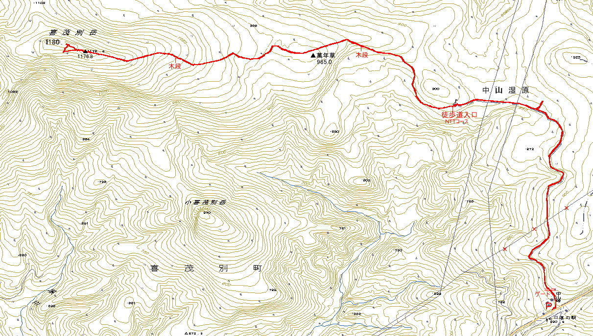 ポイント 山頂への登山道は無いが、三角点1176.8mのピークに山頂標識がある。ピークからの展望は素晴らしい。山頂は狭いので、譲り合いの精神で憩う。 NTT歩道コース:中山峠から緩やかなアップダウンのある作業道(3,520m)を辿ると無線中継所があり、その奥に、砂利を敷き詰めた広い歩道(NTTコース4,165m)の入口がある。幅2mと広い歩道は小さなギャップにも板の橋があり、わずかな登りにも丸太の階段があるなど至れり尽せりだ。トレイルランには最適な登山道だと思う。春先には中山湿原の花を見る楽しみもありそうだ。2016年6月現在は橋や丸太の階段が腐っている所があり、看板類も無くなっていて、道も荒れている。2019年9月現在には完全に廃道になったようだ。 裏の沢(新道):中岳線(林道)は、中に入るに従い舗装道路になるなど状況は良い。駐車場も完備していて、登山道の入口は少し荒れ気味だが、途中から歩道:裏の沢に上がると幅1.5mの砂利が敷かれた道になり、所々で展望がある。山頂直下はハイマツ帯で高山植物も咲いている。 |