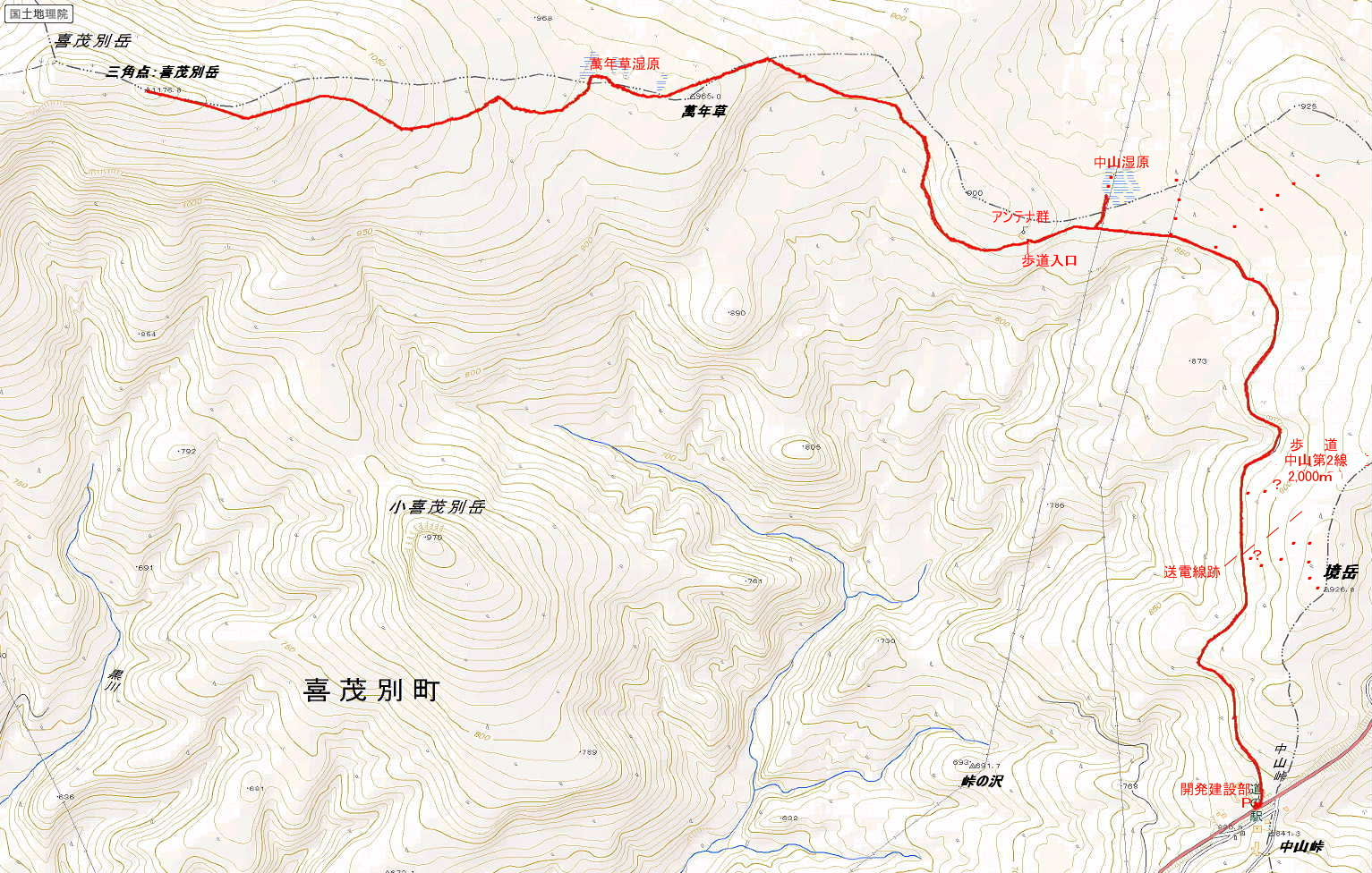 | 喜茂別岳(三角点1176.8m)萬年草湿原( 965.5m)中山湿原(872.7m) |