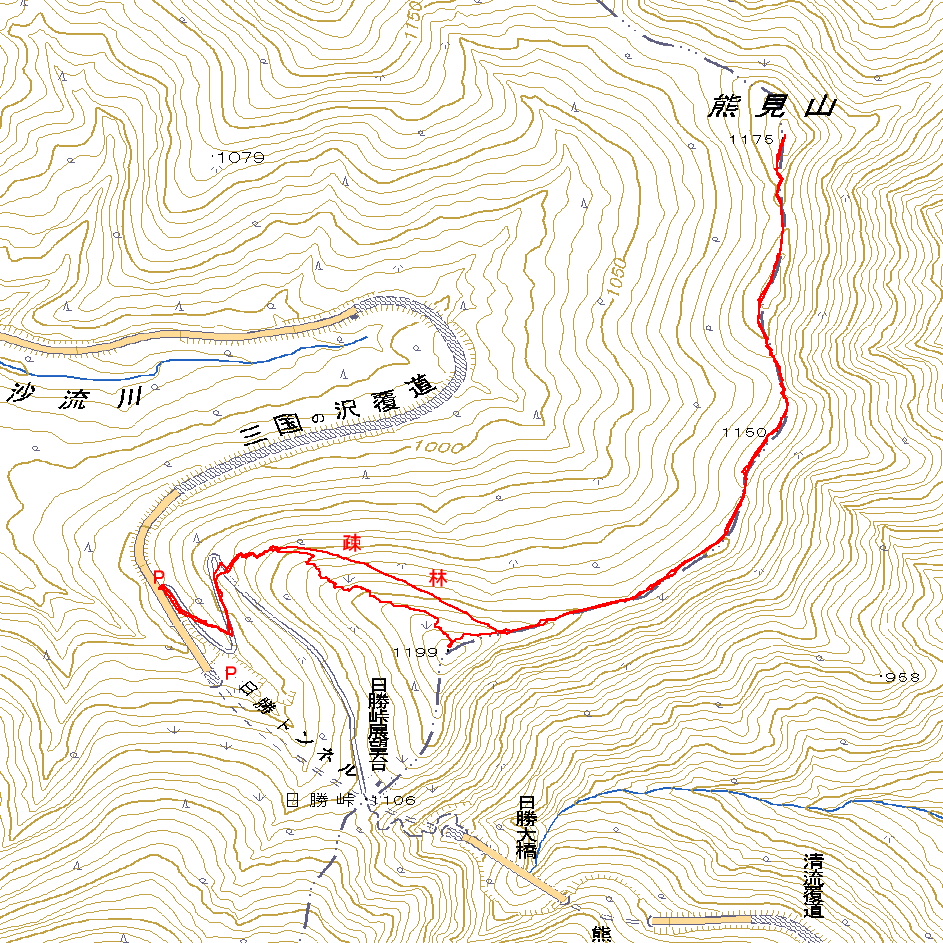 | ピークからは平野部が見え、墓場方向に道が下ってはいたが通じているかは不明だった。遠い山並みを眺めながら引き返し、送電線下の作業道を使って沢沿いの林道に下ることにする。 |