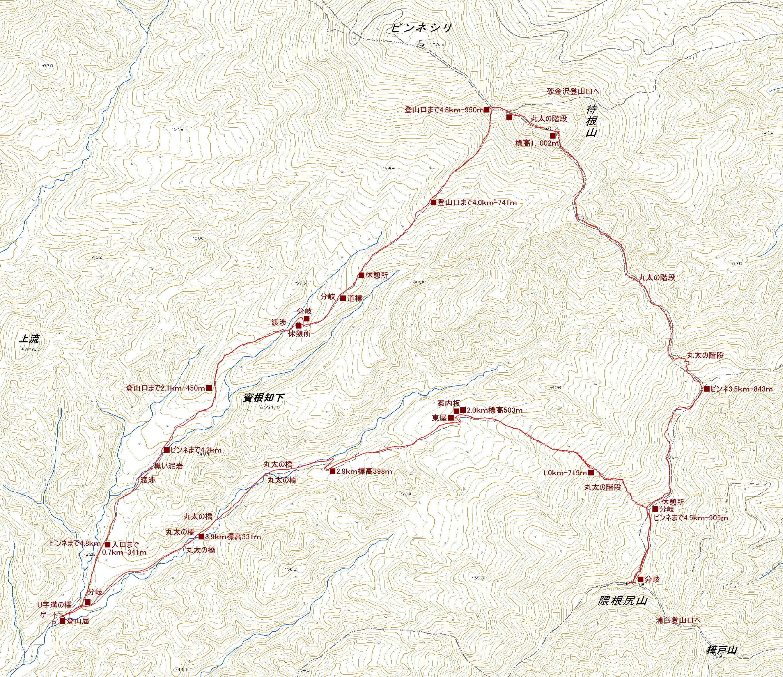 | 石炭の様な露頭 | 渡渉 | ノビネチドリ(大×) | 登山口 |