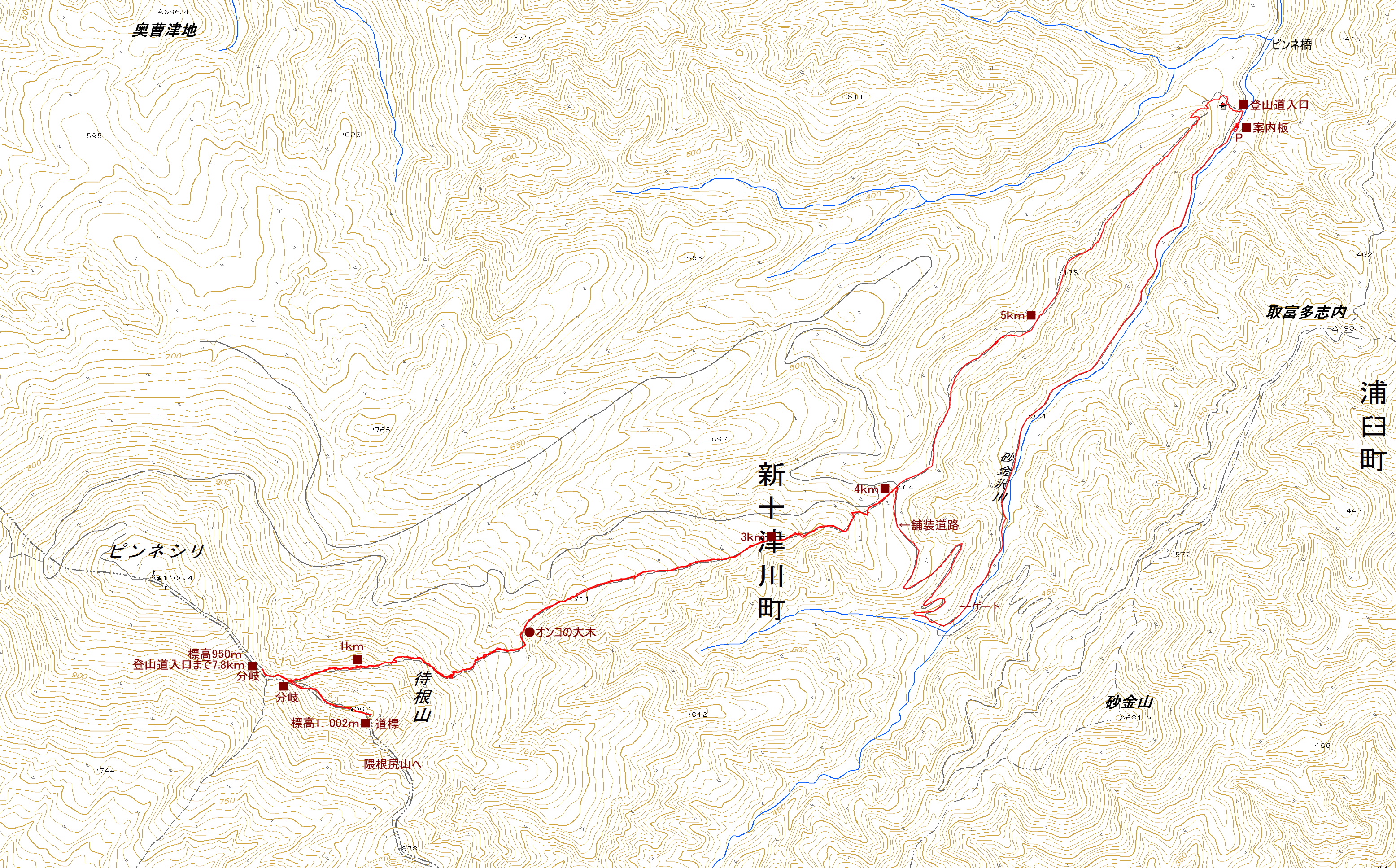 アクセス 新十津川町のそっち岳スキー場を目指す。スキー場の前を通過すると「惣富地林道 延長7,498m」の看板が立っている。林道は直ぐに分岐するので左折し、砂金沢川沿いの「砂金沢林道」に入る。入林ポストが林道右側の目立たない所にある。登山者で記入する人は稀ではないかと思うが、登山口には登山届ポストは無いので記入する。林道を辿ると、「おうぎ橋」「ぴんね橋」と通過して20分位で登山口に着く。現在は砂金沢沿いの奥まで行け、作業道から登っている人もいる。 国土地理院地図 Google Map 登山道地図クリック大→| |