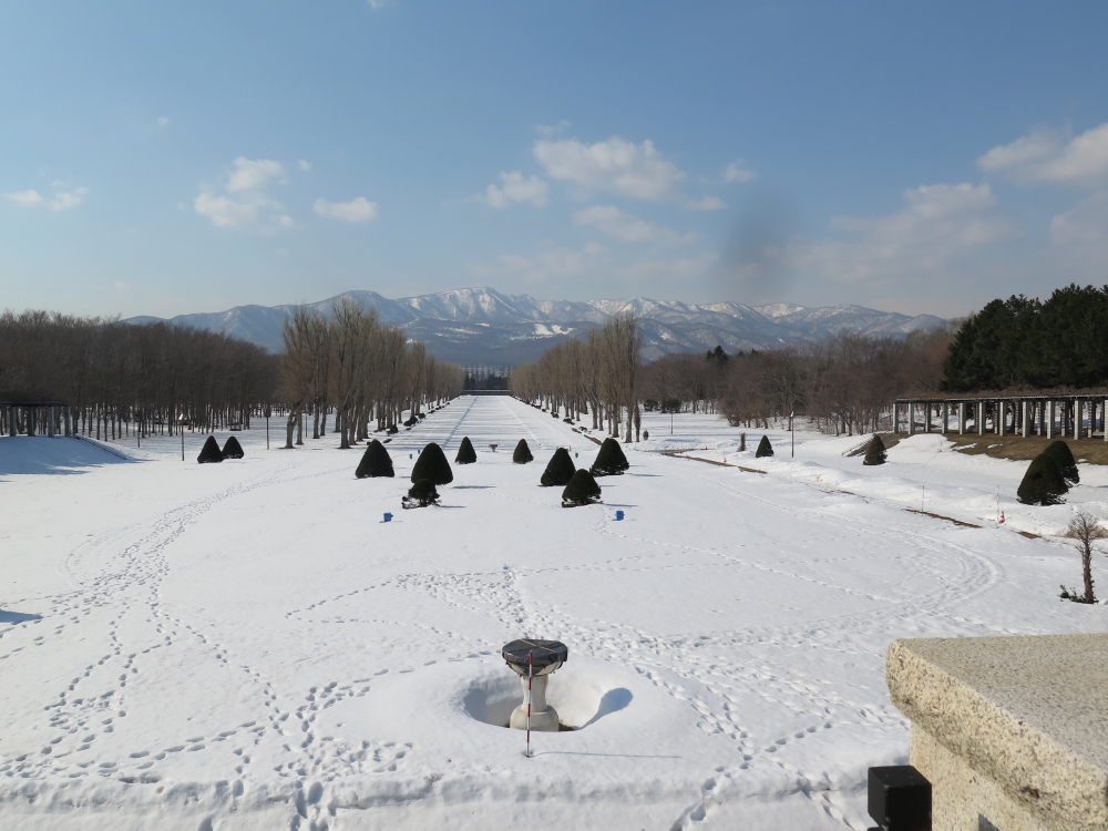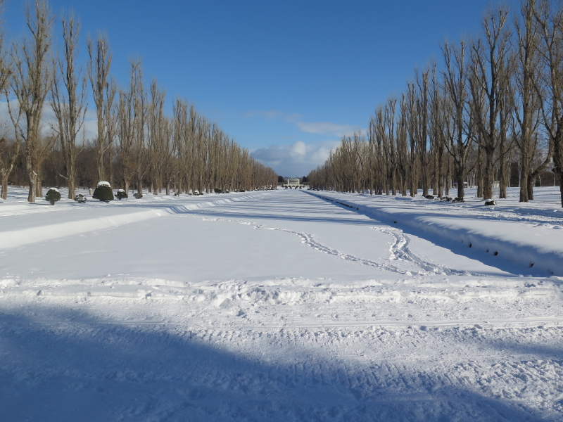 | 展望ラウンジからは、ポプラ並木に挟まれたカナールの真正面に手稲山が見える。歩くスキーコースもカナールを大きく一周しているようだ。 |