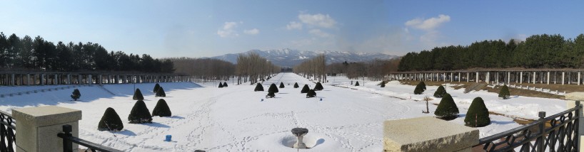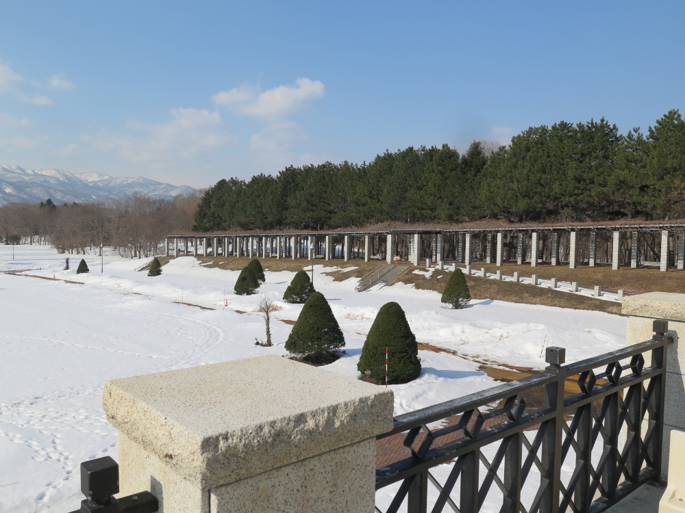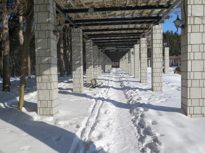 | 藤棚のある大パーゴラ越しに展望ラウンジを振り返り、公園の縁を進む。途中にある東屋は、利用可能な状態だった。カナールの南端に到着すると、壁泉はただの石垣に、カナールは改修が終わったのか雪に埋もれ、その先に、展望ラウンジが見えていた。 |