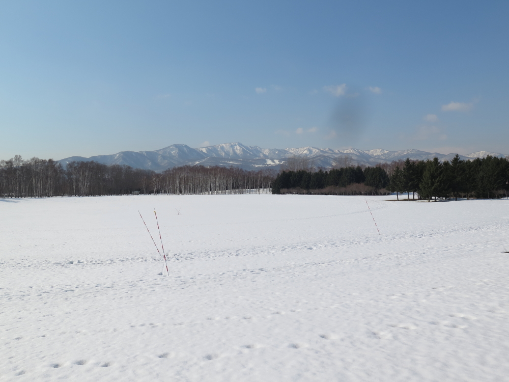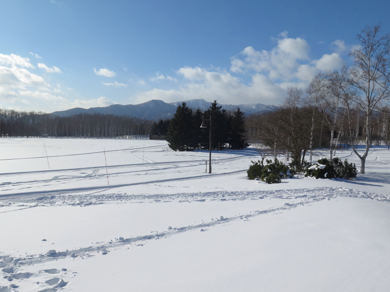 | 展望ラウンジからはカナールの延長線上に手稲山が良く見えていた。展望ラウンジから外回りをすると、歩くスキーコースの邪魔になるようなのでコースを外す。角度が変ると奥手稲山が見えて来る。公園事務に近づくと、雪上パークゴルフコースがある。最後に、広場から手稲山を望んで、駐車場近くの林に入るとシラカバ林とその影が綺麗だった。 |