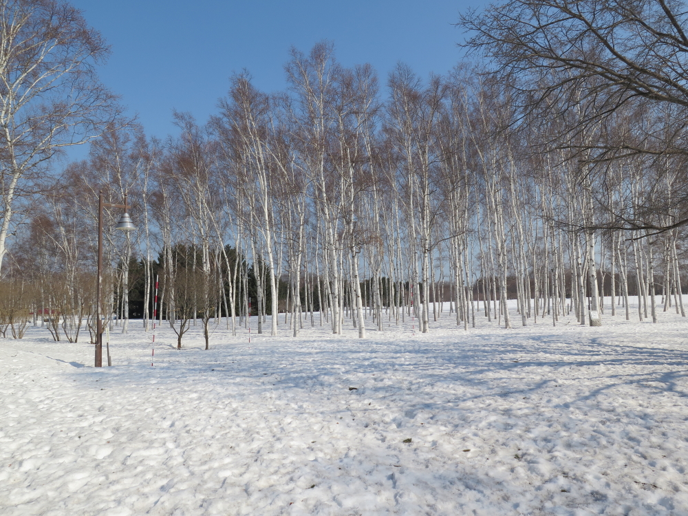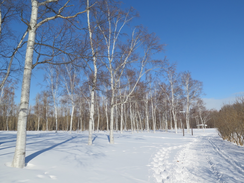 | 駐車場から入口の案内板を良く見て、外周を反時計回りに回って行く。何時もながら、白樺の並木は黒色の影のおかげか奇麗に見える。芝生広場では生徒が歩くスキーの練習をしていた。雪道はカルチパッカで鎮圧された圧雪の広い道が延びていた。 |