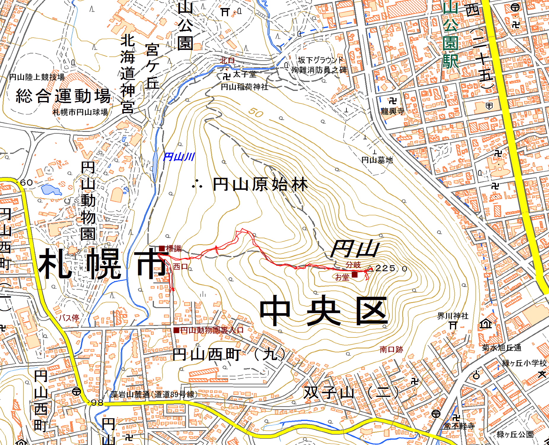 アクセス 動物園裏手(南側)にバスの旋回場とバス停があり、その傍に遊歩道の看板が建っている。この看板の所から下り、少し上ると、道端に標柱があり、その左側に「つよし幼児園(現在無し)」がある。車は数台右側に路駐できるスペースがある(現在は宅地化され無し)。標柱があり、その奥に登山口がある。 国土地理院地図 Google Map 登山道地図(208.8.17)クリック大→┃ |