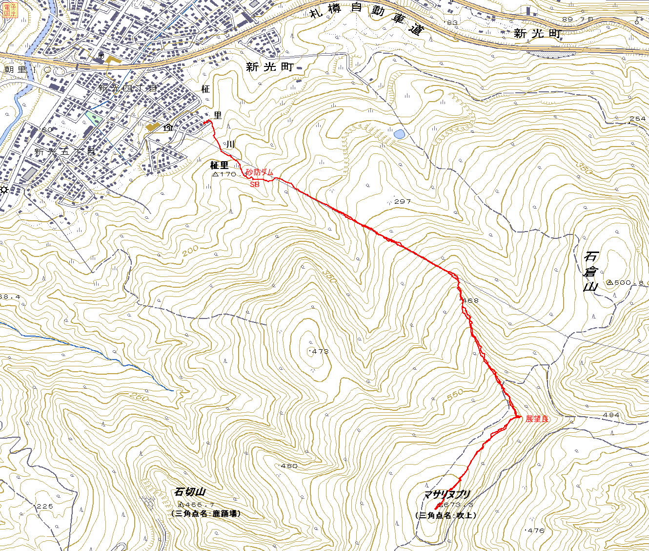 =山名考= 柾里川の源頭になる山なので、「マサリヌプリ」と勝手に呼ぶことにした。この山は小樽運河からも良く見える無名峰なので、小樽に相応しい山の名前を付けて欲しいと思っている。マサリは山麓に柾里の地名もあり、アイヌ語で浜の草地、ヌプリは山の意で、北海道らしいと思う。 地元の小樽・朝里のまちづくりの会では2009年3月31日のプログで小樽内山と呼び出したようだ。一般的には川の名前、山麓の地名から山名を付けることが多い。小樽内川はさっぽろ湖に注いでいるし、オタルナイ湖はあるはあるが、間にエゾ松沢川が流れている。昔の石狩の浜の名前オタ・ル(オル)・ナイが、転化して小樽になったので、地名は地名だが山の名前の付け方としては異色だと思う。 |