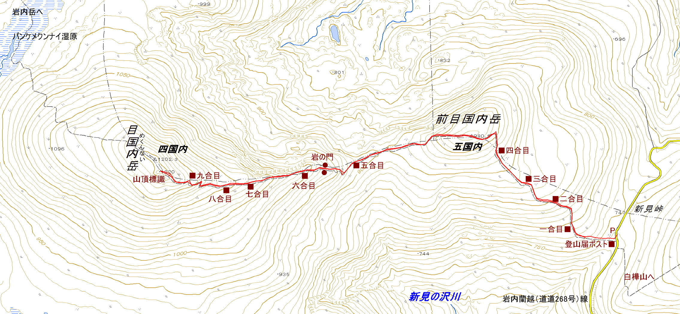 =三角点名考= 目国内岳周辺には7つの「国内」と付く三角点があります。地図に1〜7の位置を下ろしてみたら、逆十字にも見えますが?基準点コードの若い順に並べると七国内が一番若く、次に一 国内と言うことは、何が何でも7つの「国内」名を付けると言う強い意志が感じられます。不思議な三角点の名付け方ではないでしょうか。 一国内(いちこくない) 252.82 m TR36440231901(2) 二国内 582.12 m TR36440235401(4) 三国内 969.87 m TR36440236801(5) 四国内(目国内岳) 1202.25 m TR36440247101(6) 五国内(前目国内岳) 980.43 m TR36440247301(7) 六国内(ろっこくない) 33.49 m TR36440232601(3) 七国内(しちこくない) 57.98 m TR36440139701(1) |