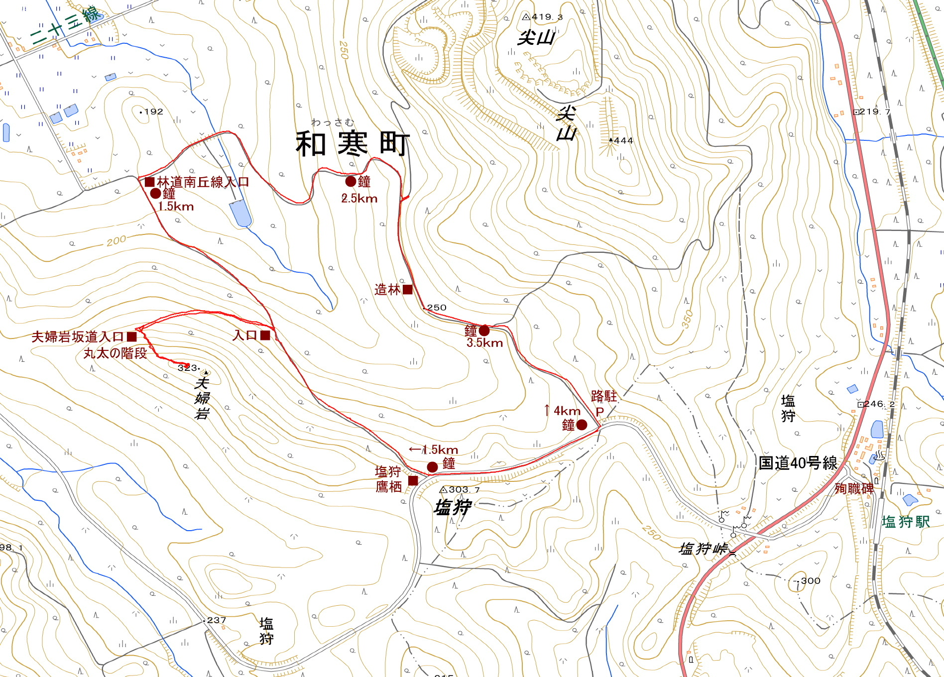 アクセス 名寄国道(40号線)を北上して和寒町に入ると直ぐに塩狩峠(道路沿いには何もない)になり、陸橋に「Welcome わっさむ町塩狩峠」」の看板がある。夫婦岩に行くにはこの陸橋を渡るので、一旦下り、塩狩ヒュッテの看板に従い右折する。右折すると道は三叉路になり、左へ行けばヒュッテや駅、真っすぐは通行禁止、右が夫婦岩への道となる。国道で、下を潜った陸橋を渡ると、フットパス用の鐘の付いた道標「夫婦岩4km地点」、その奥に「夫婦岩1.5km地点」がある。塩狩ヒュッテの電話は0165-32-4600。 国土地理院地図 Google Map 登山道地図クリック大→| |