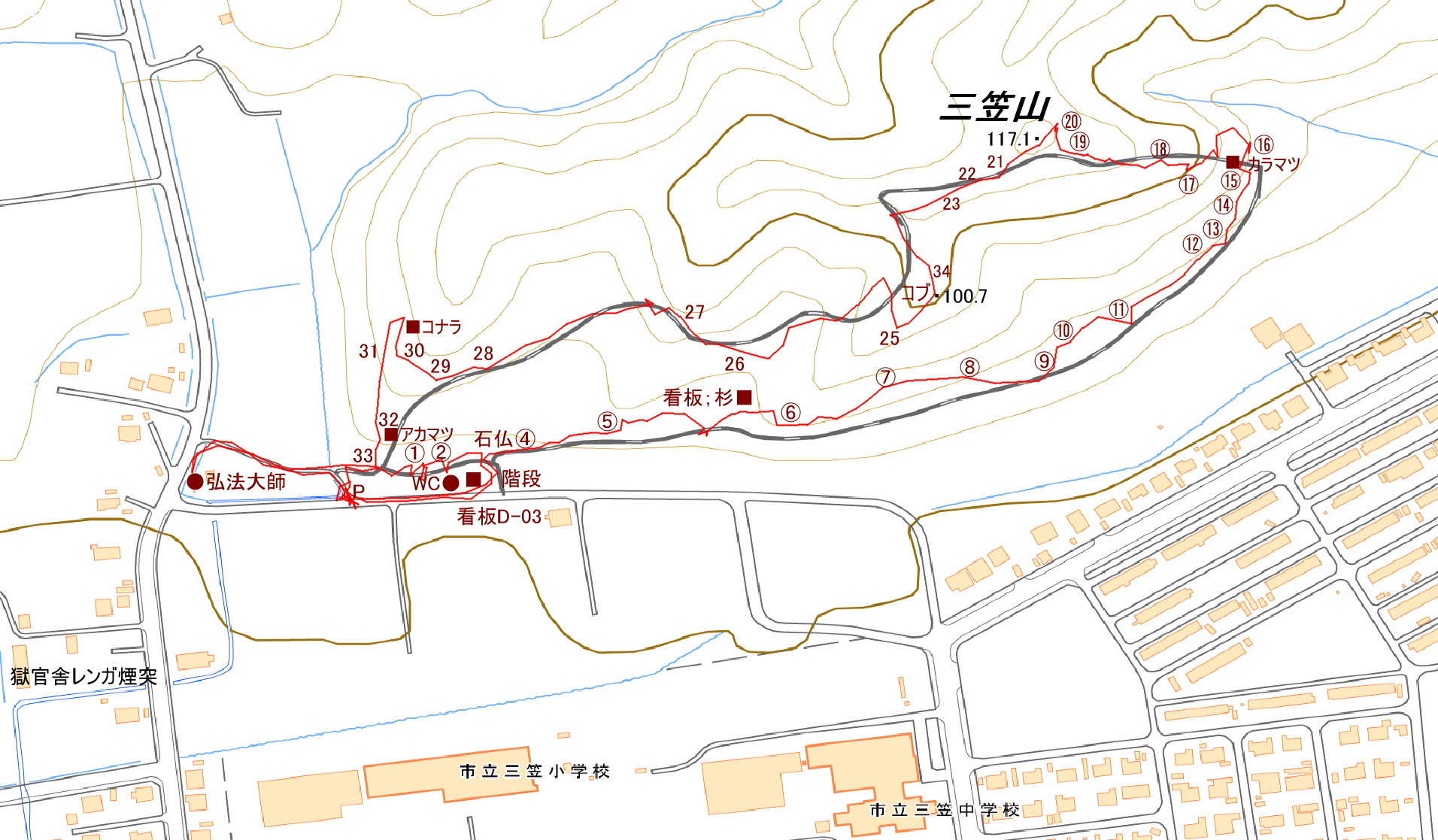 アクセス 岩見沢三笠(道道116号)線から三笠小学校へと北上する。旧空知集治監典 獄官舎レンガ煙突が左手に見えてくると直ぐに、三叉路になる。三叉路の北側に弘法大師像からの入口がある。この手前を右折すると、直ぐ左手に駐車スペースがある。石仏を一番から辿るならここから登り、道路沿いの遊歩道を進む。三笠山の入口へは更に進むと直ぐ木の大木に模したトイレと解説板がある(駐車スペースは無い)。丸太の階段を登って4番から辿ることになる。 国土地理院地図 Google Map 登山道地図クリック大→| |