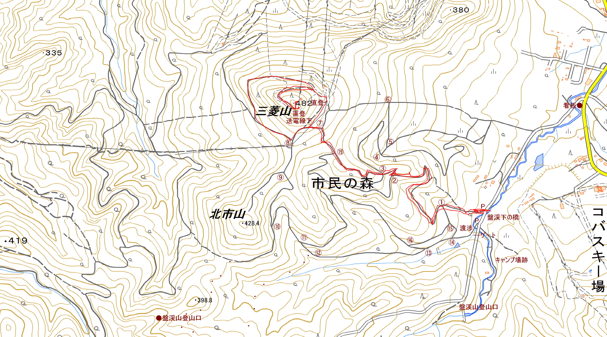 | 順路 @-A-B-R-F-G-スキー場-山頂-送電線下-F→R-B-A-@ |