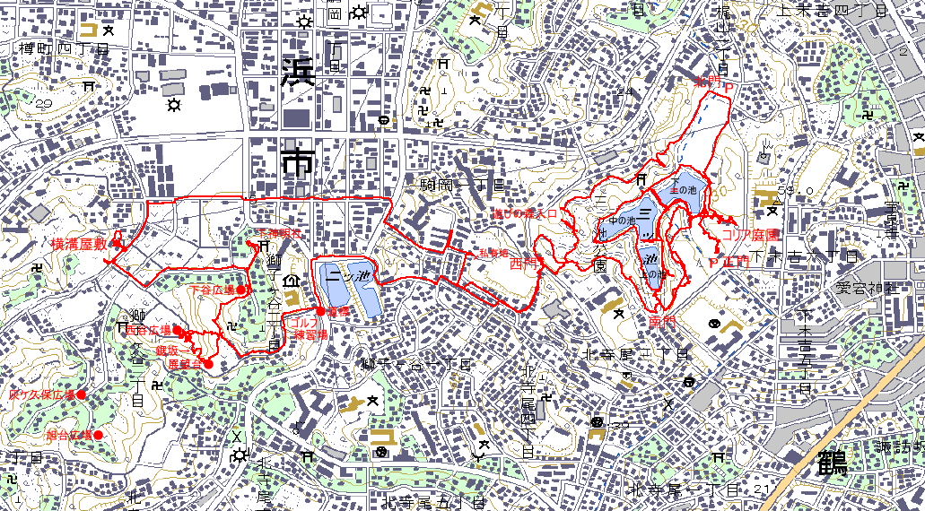 | 三ツ池(H17m)二ツ池(H8m)獅子ケ谷市民の森(43m) |