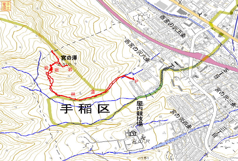| アクセス 手稲から国道5号線を札幌方向に走り、右手の宮越家具から南19条宮の沢線に右折する。札樽道を潜って、すぐ右側に真っ直ぐ山に向かう道があり、左折や右折をしながら分譲地の一番上まで行って車を停める。分譲地から三角点:宮の沢を見上げながら山に向かうと直ぐ林道がある。 国土地理院地図 Google マップ ルート図(2013.1.11)大→┃ |