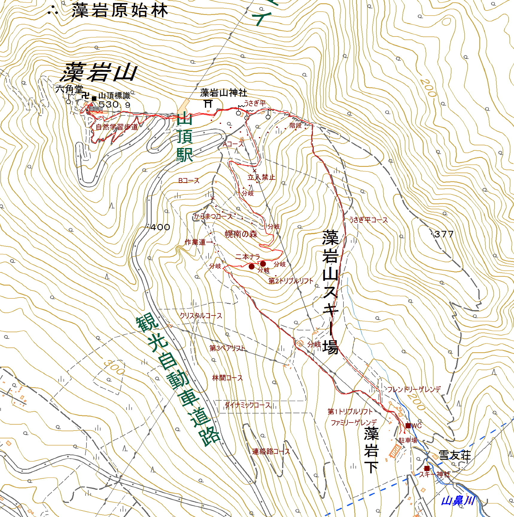 | 自然歩道入口 | 舗装された道 | 377m峰 | ゲレンデを下る |