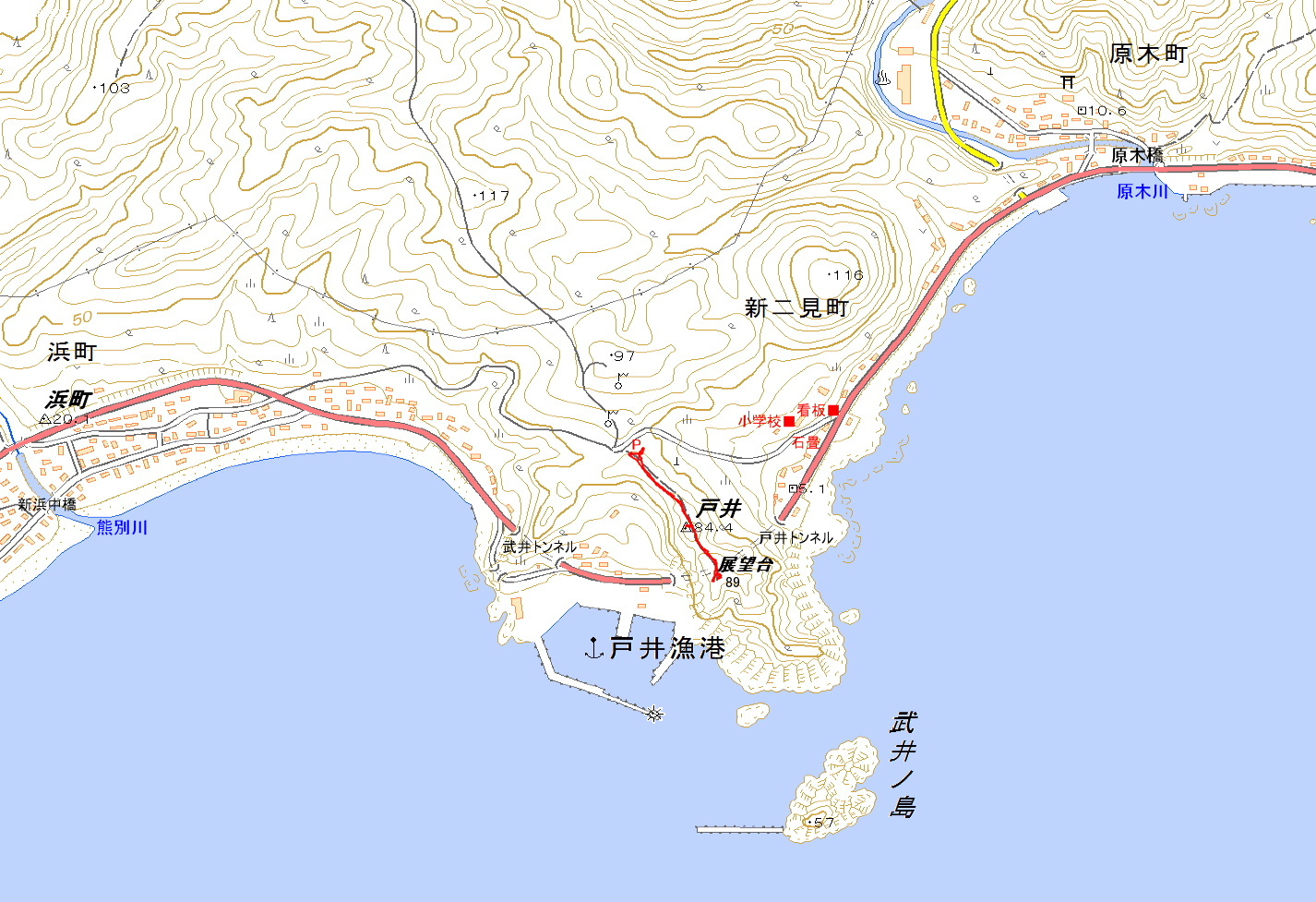 アクセス 国道278号線沿いに看板があり、そこから石畳の道が延びている。小学校の校門を越えて中に入って行くと、舗装道路になりどん尻に駐車場がある戸井憩いの丘公園に着く。三角点:戸井84.4mがある。 国土地理院地図 Google Map 登山道地図クリック大→| |