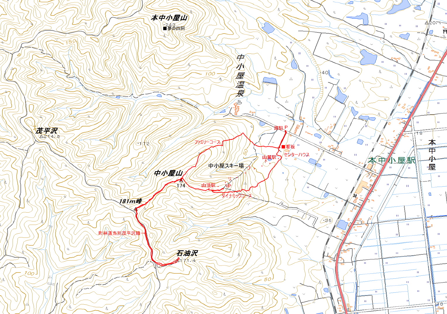 | 中小屋山(スキー場:170.3m)三角点:石油沢(171.4m) |