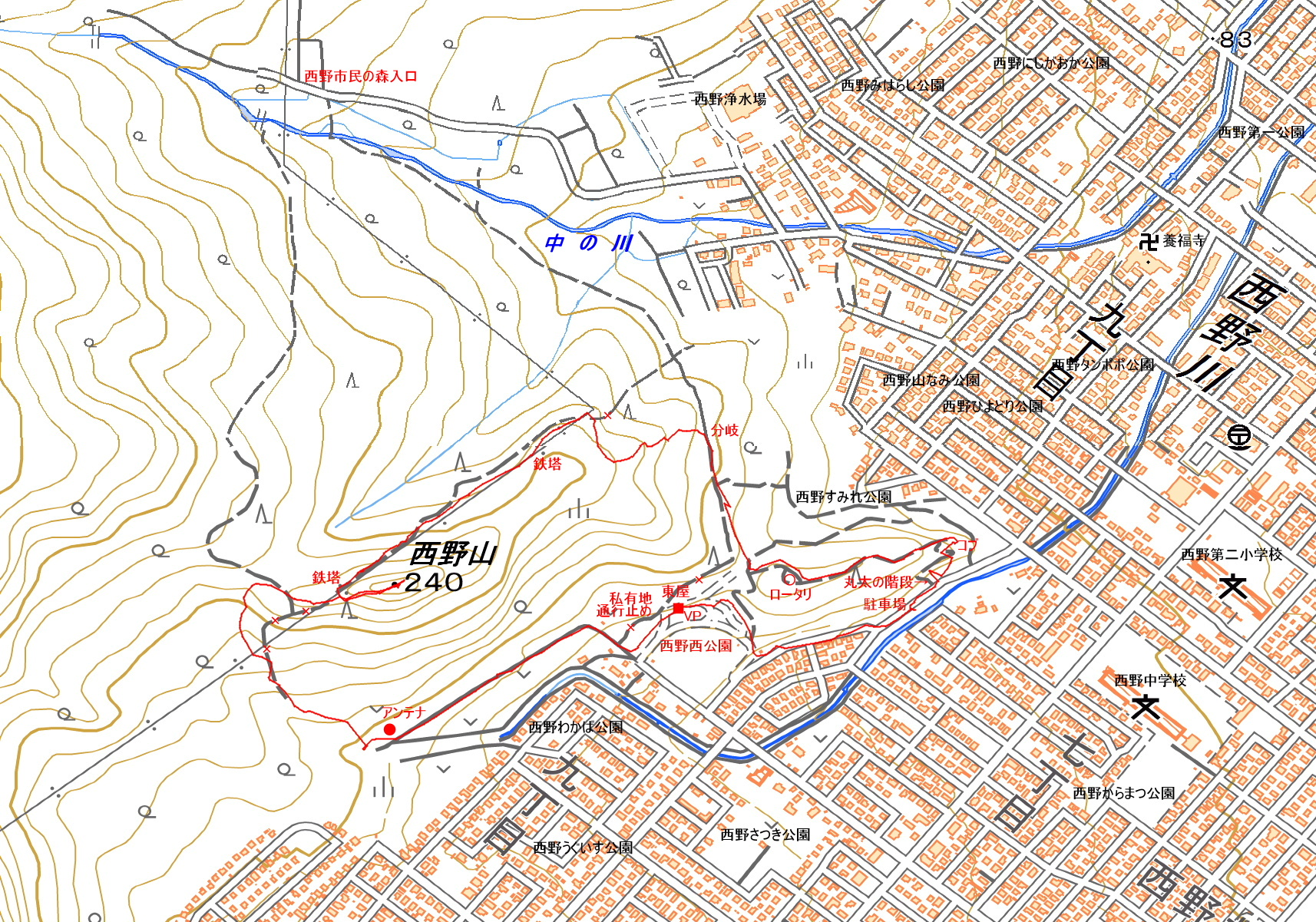 ポイント 西野西公園の東手前に駐車場があり、遊歩道が延びている。遊歩道はロータリ部分で西野市民の森遊歩道に繋がっている。送電線の保守道路から山頂に夏道があり、地元の人達の散歩道になっている。西野川の源頭の山でもある。 |