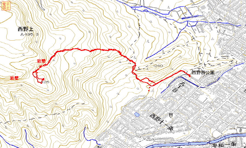 ポイント 西野西公園には駐車場がない。山頂は藪で見晴らしは良くない。西野上山495.3mには小さな沢を登ると行けそうだった。 |