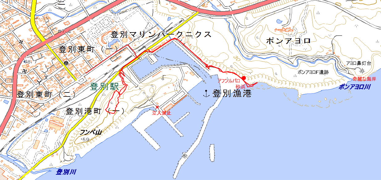 アヨロ鼻灯台(カムイエカシチャシ) ポンアヨロ海岸(遺跡) フンペ山(59m) 蘭法華岬 アフンルバロ(パル) イタンキ岬 |
