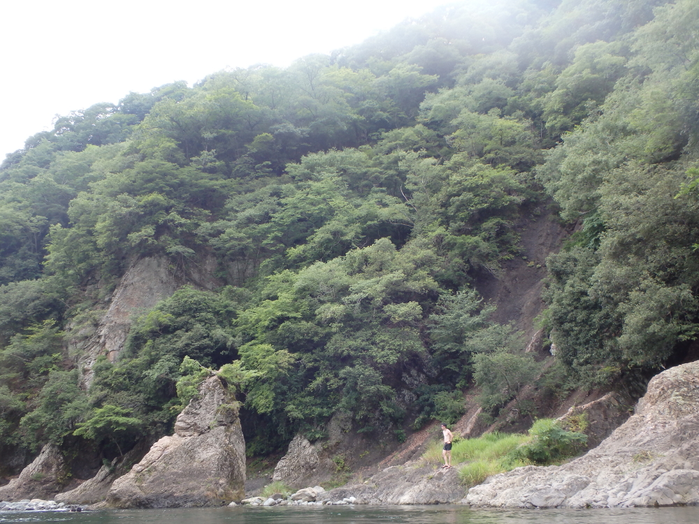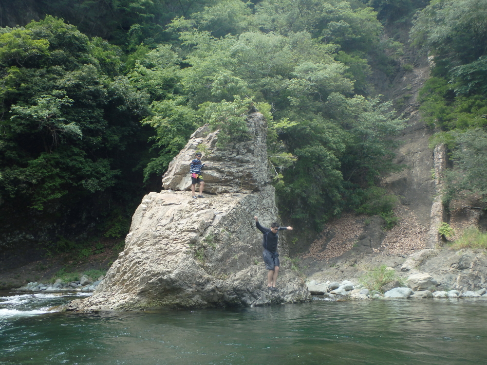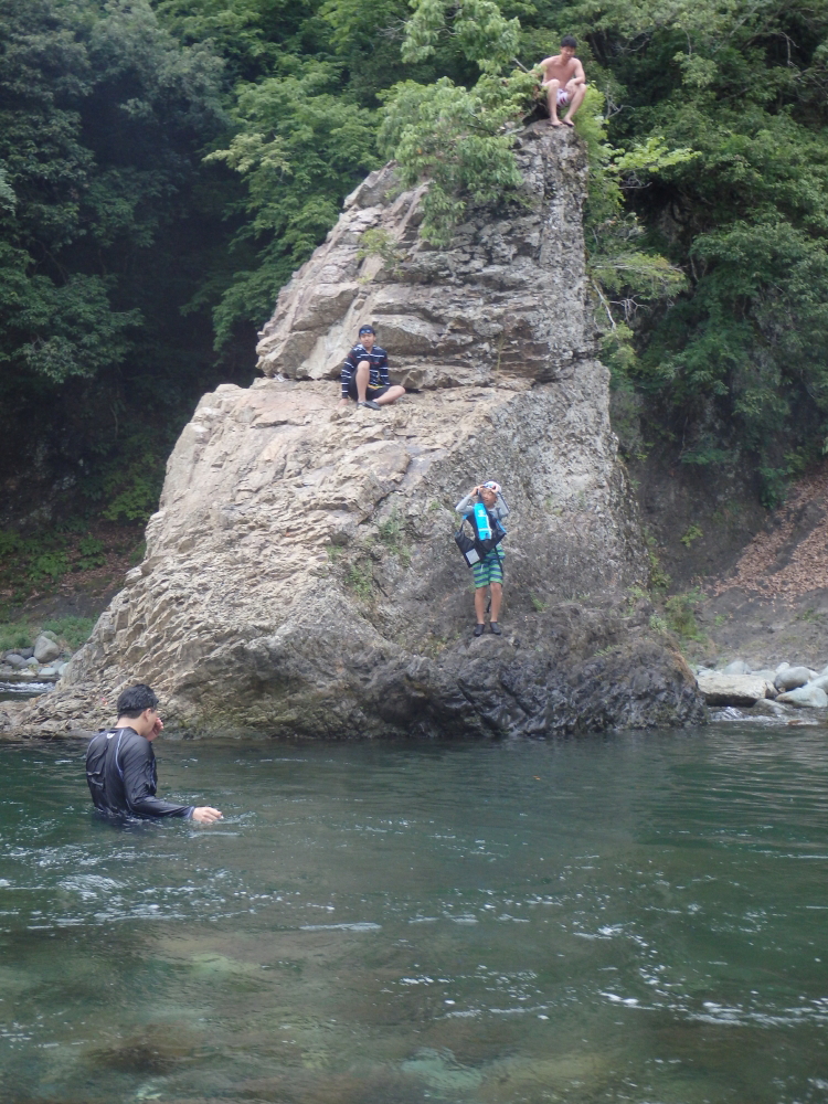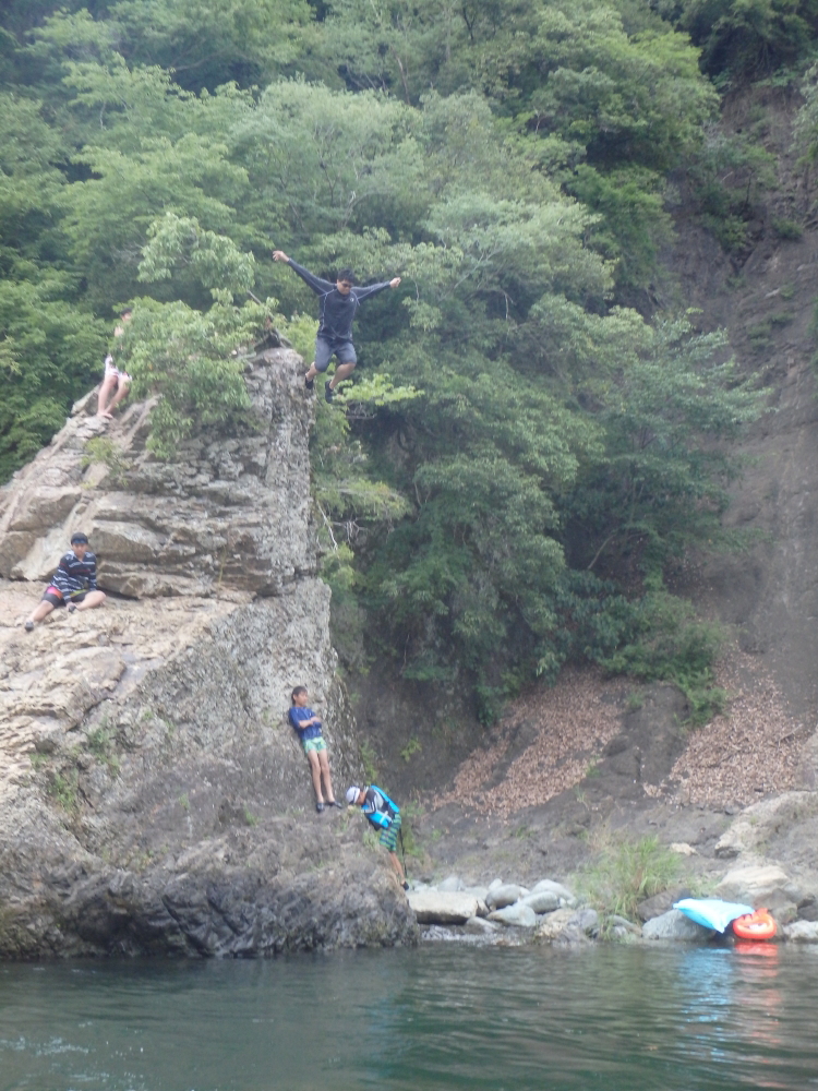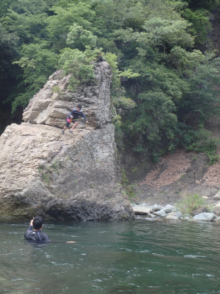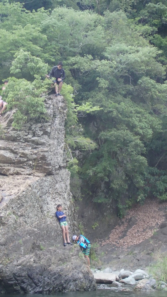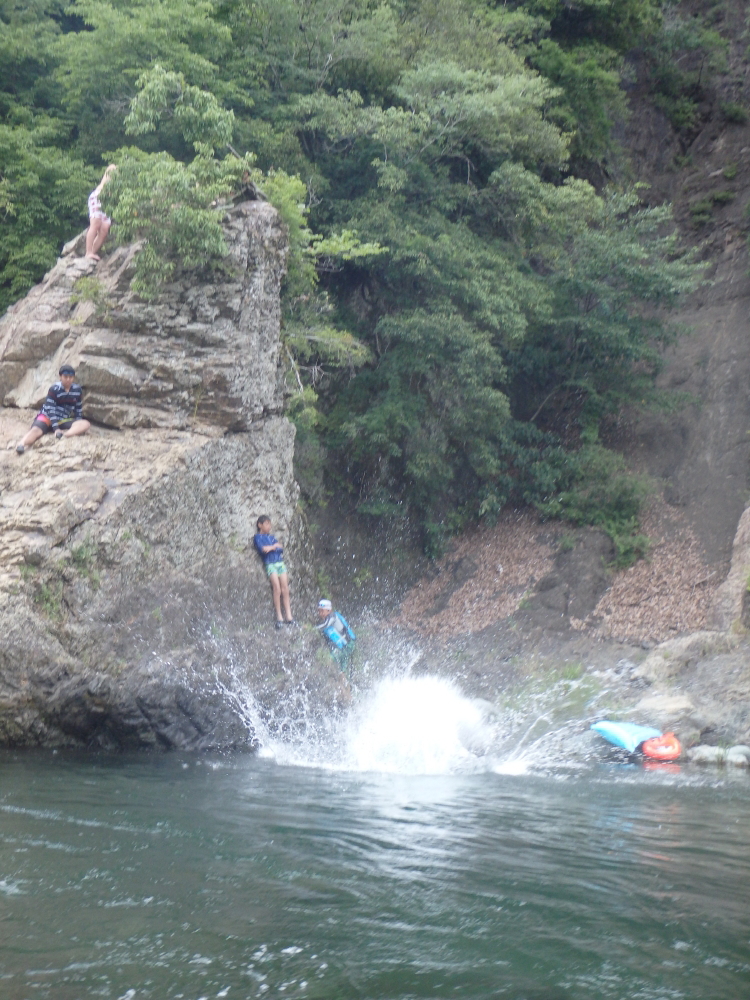 | 岩の中腹では物足りなかったのか、天辺から飛び込む。爆弾の様な大きな水飛沫を上げて無事着水するが、足が川底に着いてしまったようだ。飛び込みについては当時自己責任だったが、現在はキャンプ場のHPで飛び込まないように注意喚起をしているようだ。 |