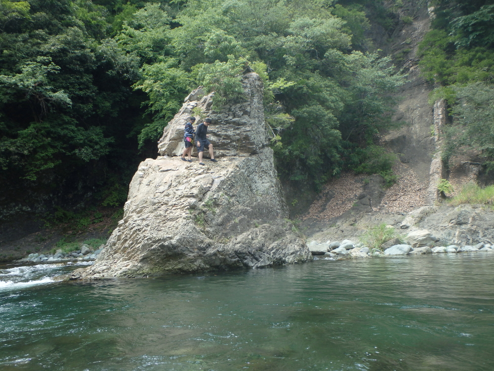 | 目の前には、600万年前の地層と言われる岩が連なっていた。その中に、飛び込み岩とも呼ばれている天王岩があったので、中腹まで登って見る。早速、兄弟で天王淵に飛び込んで遊ぶ。 |