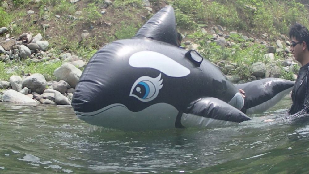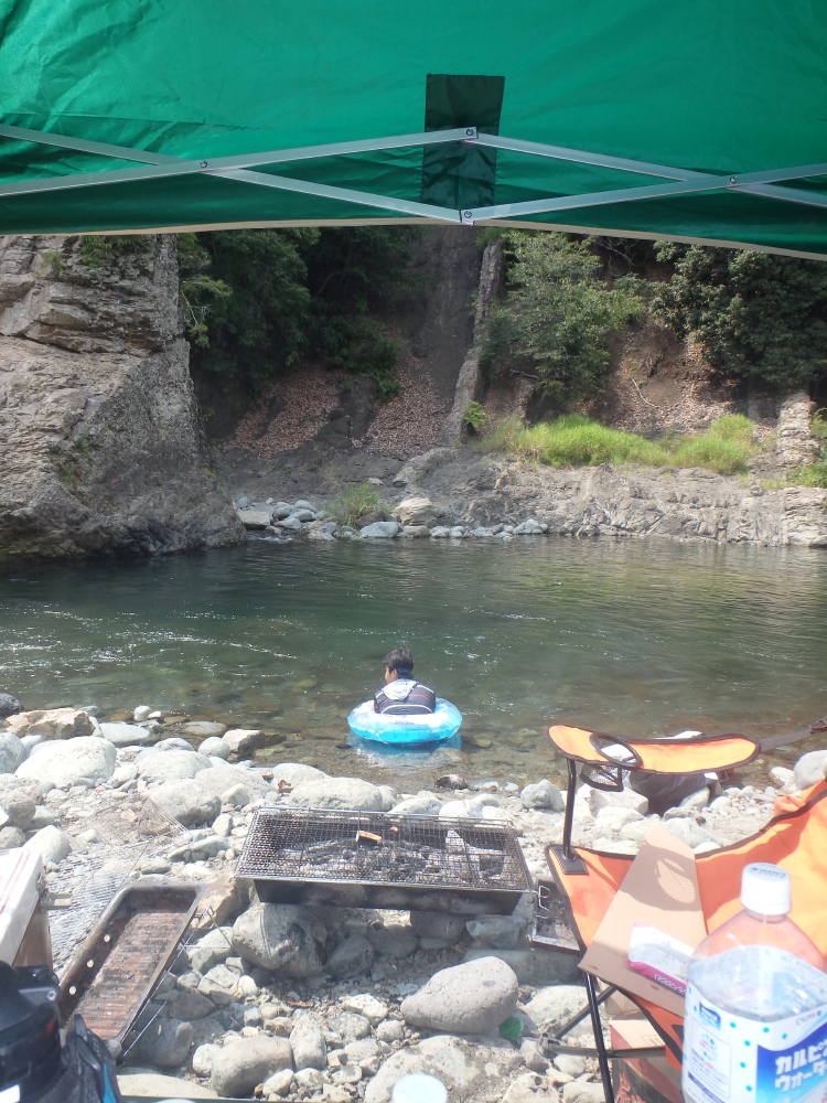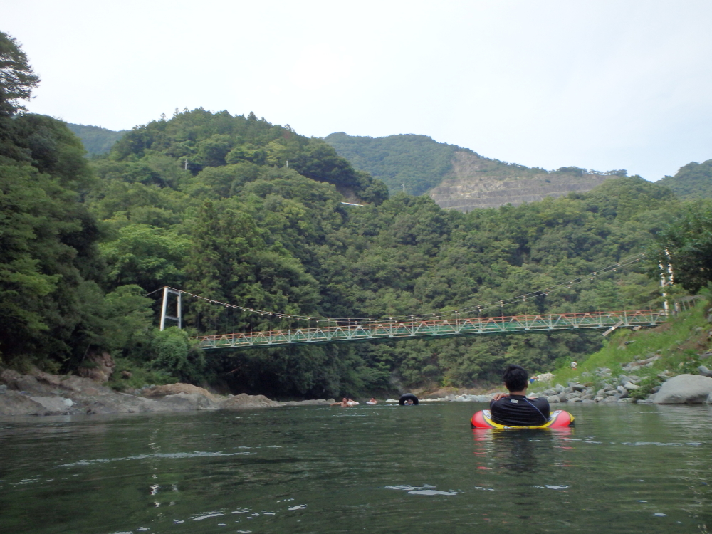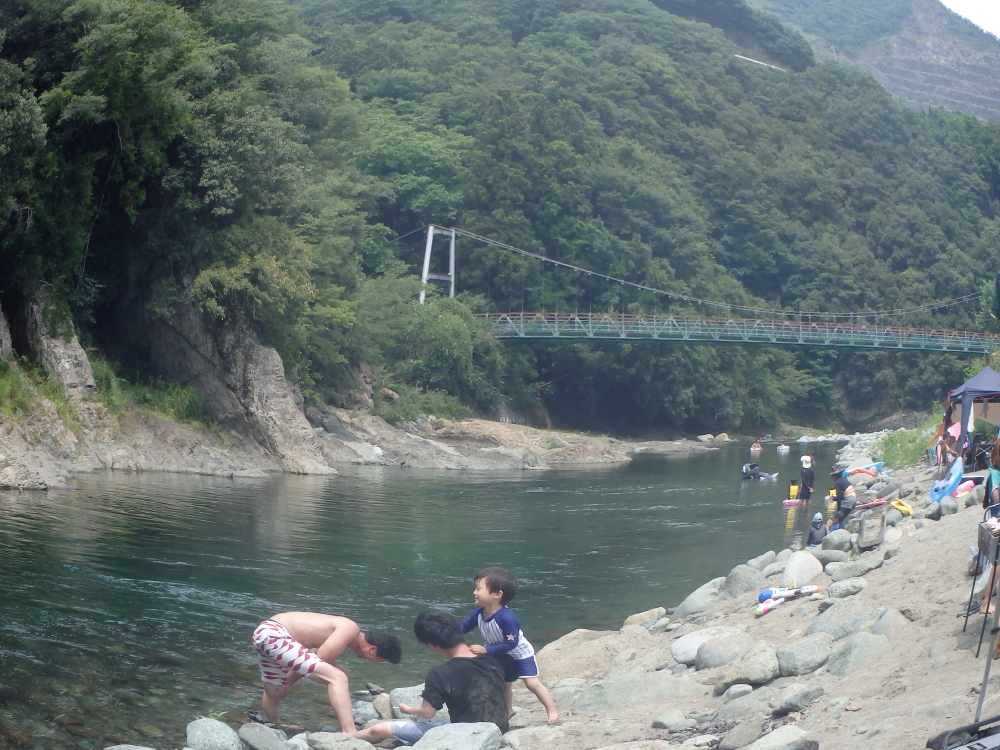 | キャンプサイトは川の傍なので、イルカの浮輪や浮輪に乗ったりと遊ぶ。吊り橋の上には藤野津久井(県道518号)線が見えていた。バーベキューが終わると、また川遊びをする。 |