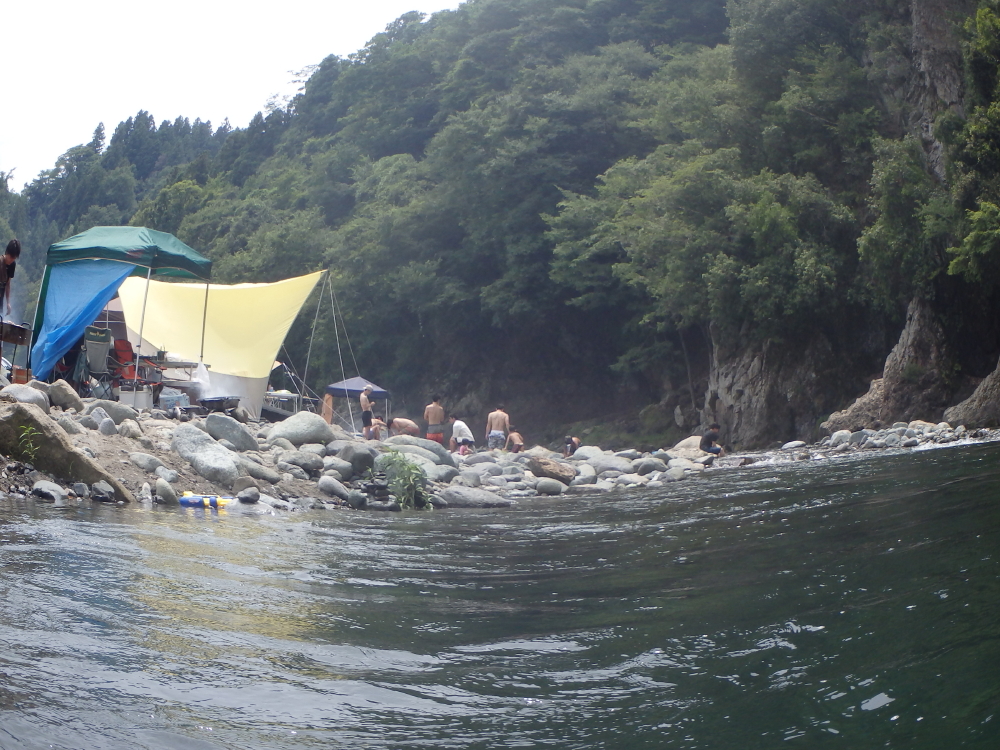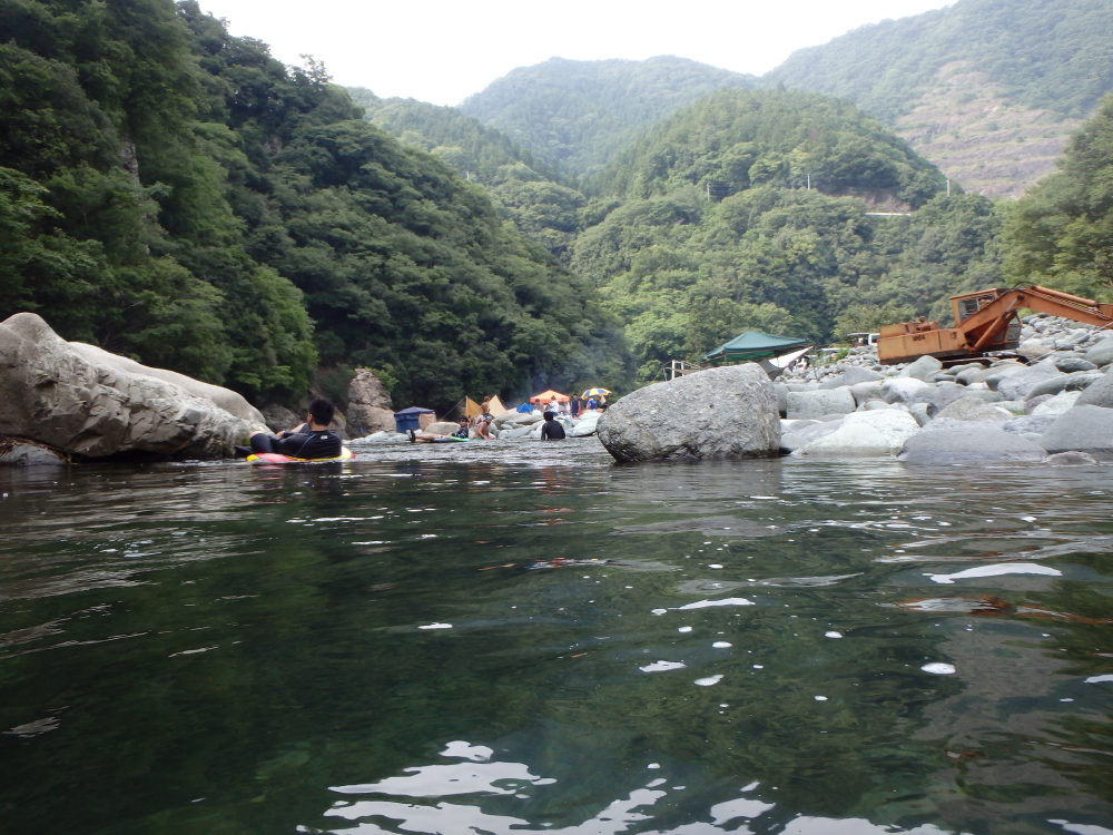 | 川辺のキャンプサイドから道志川の清流道を清流を眺められる。川辺にユンボがるのは、このキャンプ場を同定する目印のようだ。もう一つ、このキャンプ場には滝巡りのための歩行者様の吊り橋がある。 |