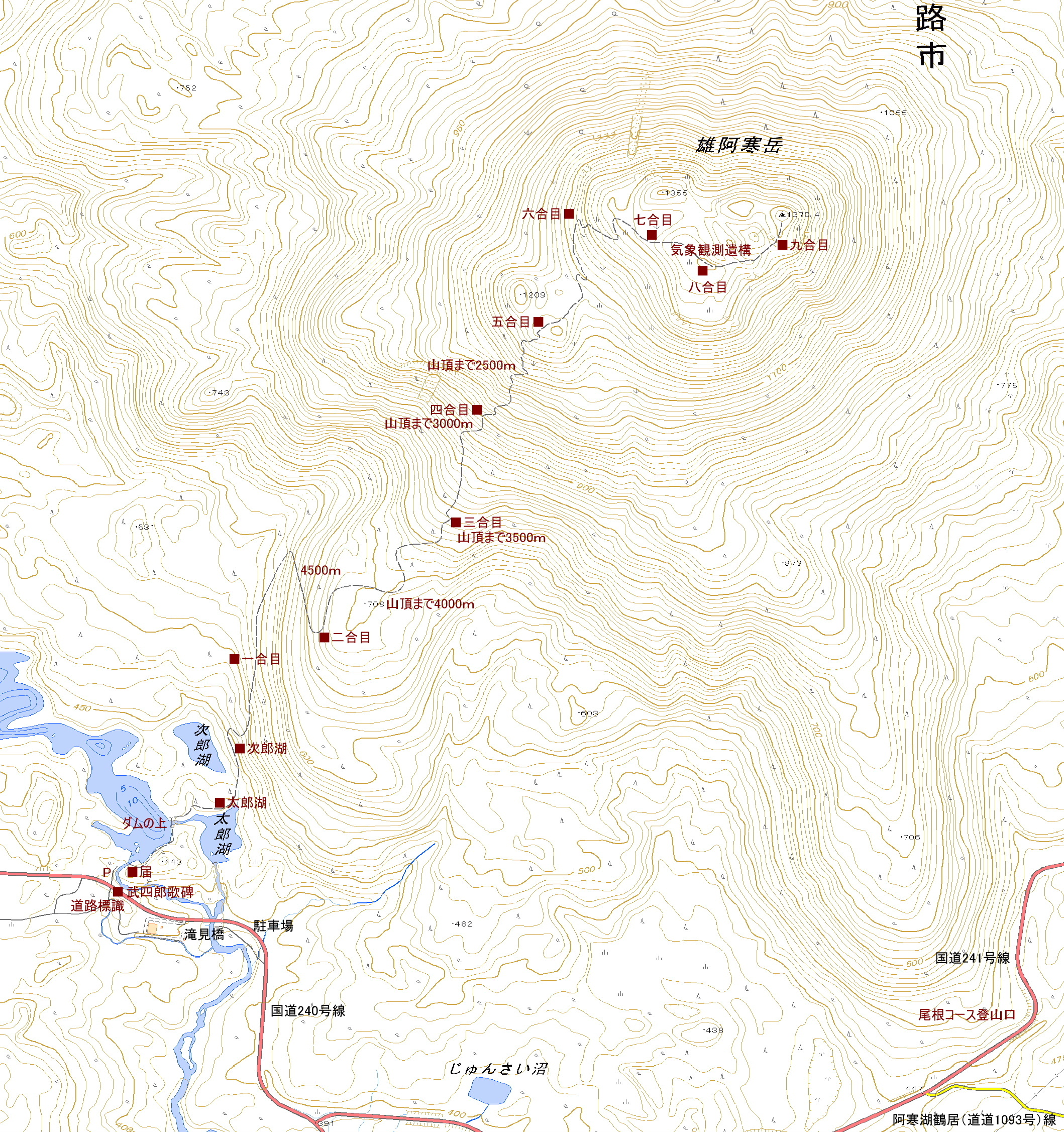 アクセス 帯広起点の国道241号線を走り、阿寒湖畔を過ぎると、道を横切る大きな看板が見えてくる。そこを左に曲がると、トイレ付きの駐車場がある。登山ポストは滝口の奥にある。 国土地理院地図 Google Map 登山道地図クリック大→| |