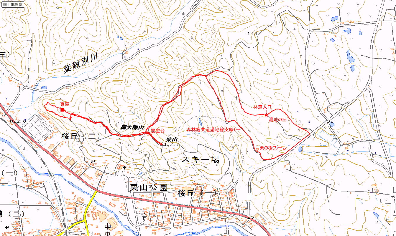 二人の山行記録(遊びの時間を含む) 2014(H26)年10月11日(土) 曇り 一周4.926km 1:06 14:13林道入口→14:25林道T分岐→14:33展望台→14:36Y分岐→15分間栗拾い→14:53東屋→14:58分岐→15:00尾根道へ→15:09三角点→15:18栗の木ファーム分岐→15:25栗の木ファーム→15:34林道入口 |