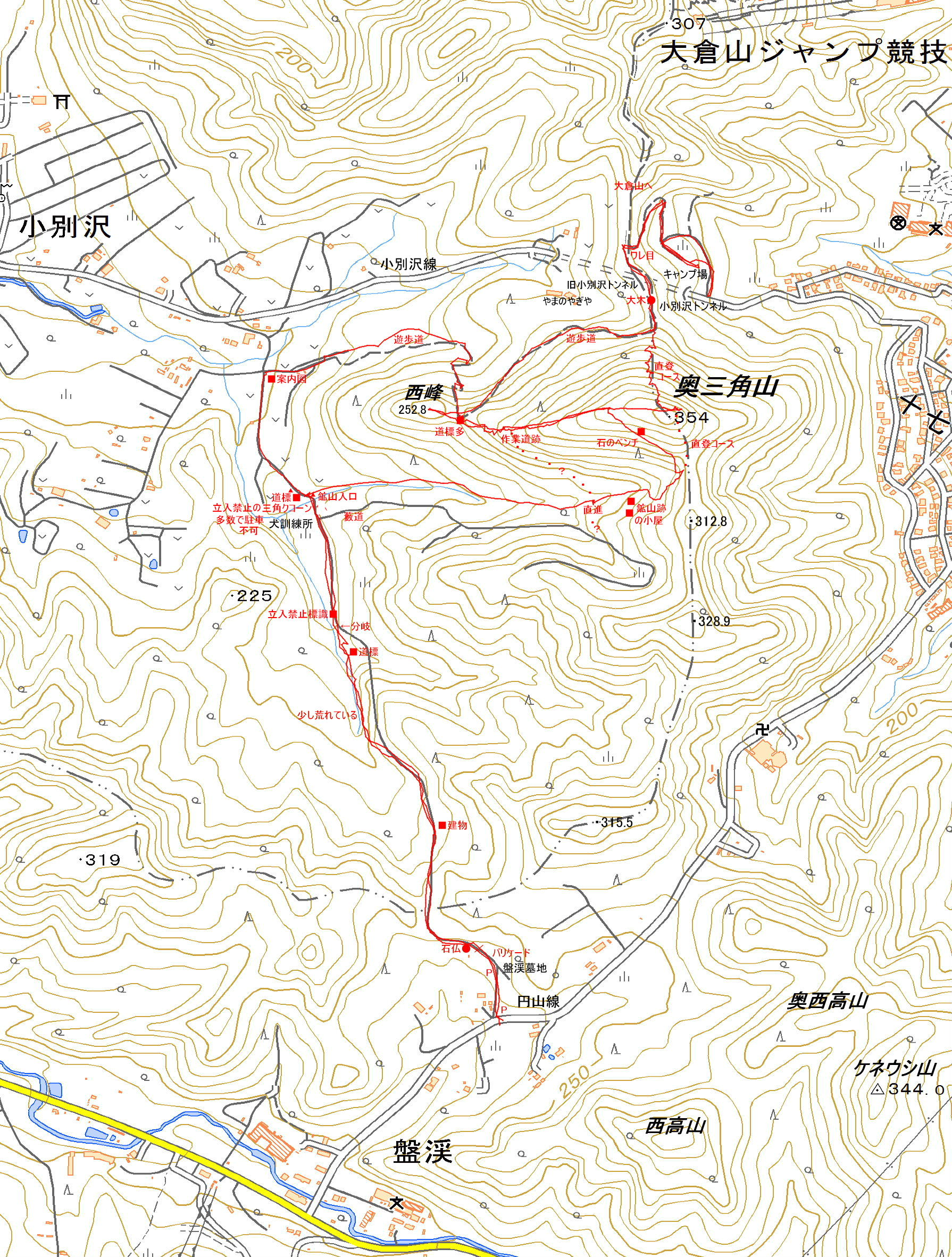 山行記録 2014(H26)年4月30日(水) 晴れ 一周6.627km 2:34 9:07盤渓墓地入口→9:09墓地→9:14建物→9:20道標→9:21分岐→9:22看板:進入禁止→犬訓練所横→9::26鉱山入口→9:30小別沢入口→9:45コル分岐(西峰往復)9:52→9:59直登分岐→10:09ワレメ→10:12キャンプ場入口→10:20ワレ目→10:24直登分岐→10:39奥三角山10:43→10:44鉱山分岐→10:49コル分岐→11:00鉱山分岐→11:06直登分岐→11:11十字路直進→11:19鉱山入口→犬訓練所→11:23立入禁止標識→11:24分岐(直進)→11:25道標→11:33建物→11:36峠→11:39墓地→11:41盤渓墓地入口 |