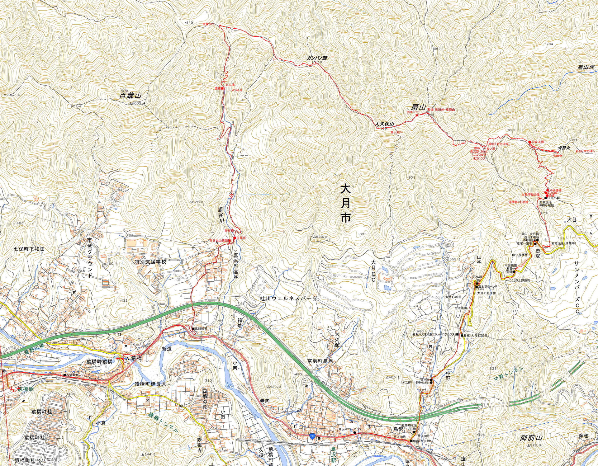 | 鳥沢駅→君恋温泉→山頂→宮谷→猿橋駅着コース |