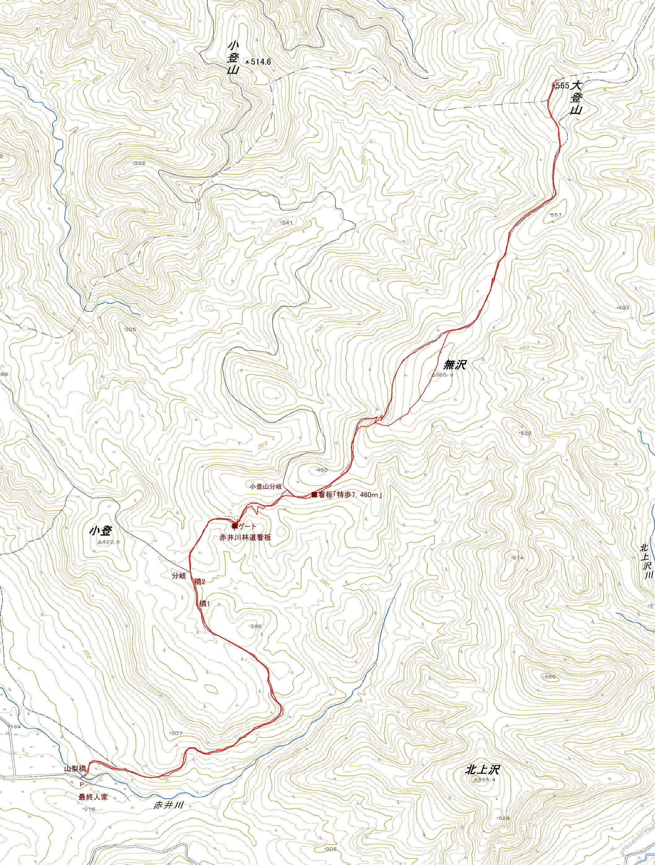 | 500m峰 | 像の形(三角点:無沢) | 三角点:北上沢 | 560m峰 |
