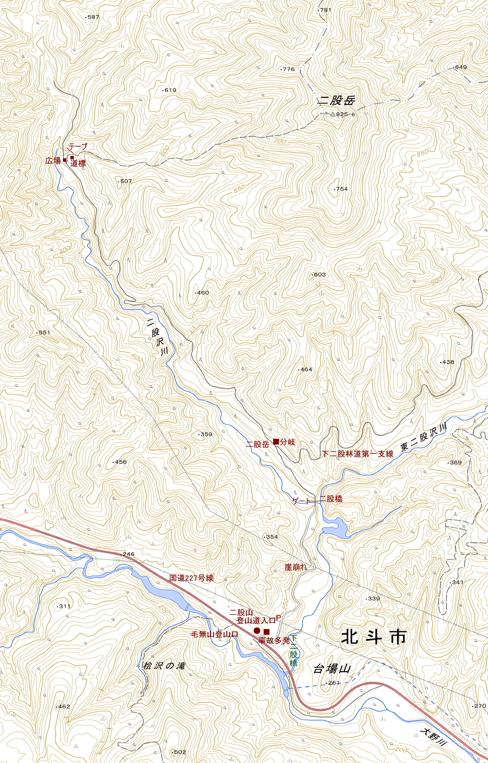アクセス 函館方向からは大野を横切る国道227号線を厚沢部町方向へ行くと、大野町きじひき高原の大きな看板がある。それをやり過ごして、二車線の登坂車線に入る直前、右側に丸太で作った大きいが目立たない標識「二股岳入口」と書かれた林道の入口がある。林道を入ると、直ぐに「この山は命にかかわる事故多発!」の看板が威圧する。車で林道を辿ると、崖崩れで「二股橋」のゲートまで行けず、引き返し送電線下に停める。 国土地理院地図 Google Map |