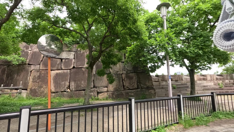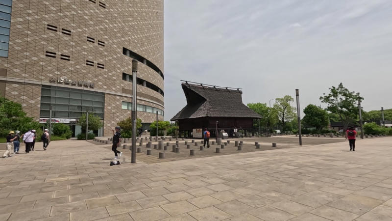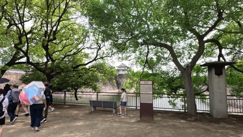| 地下鉄谷町四丁目駅から難波宮公園に入ると、大阪歴史博物館がありその前に法円坂遺跡の茅葺の建物が見えた。本町通と上町筋が交わる交差点を渡り、エレクトリックカーの馬場町駅から入ると、目の前に円いローソン S大手前レストハウス店がある。この辺りは大手前の馬場跡のようだ。南外堀沿いには解説板とラジオ塔がある。南外堀沿いからは木立越しに六番櫓が見えてくる。 |