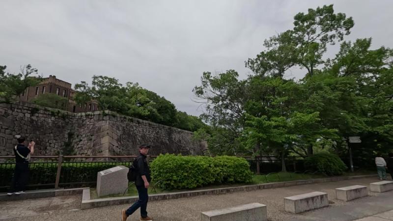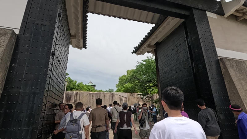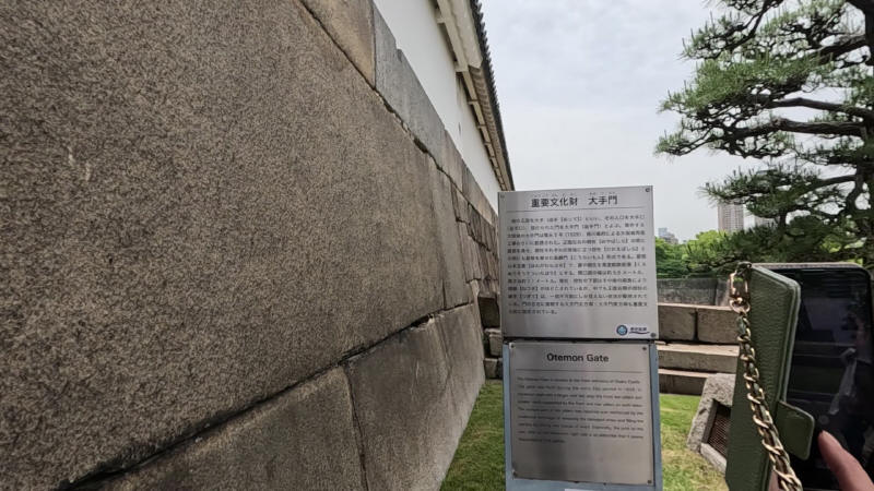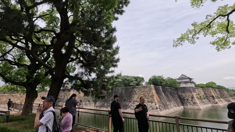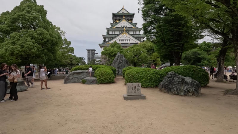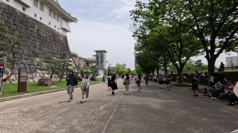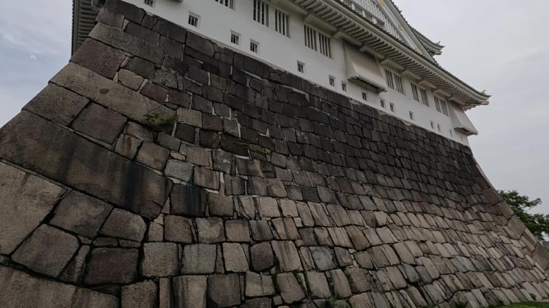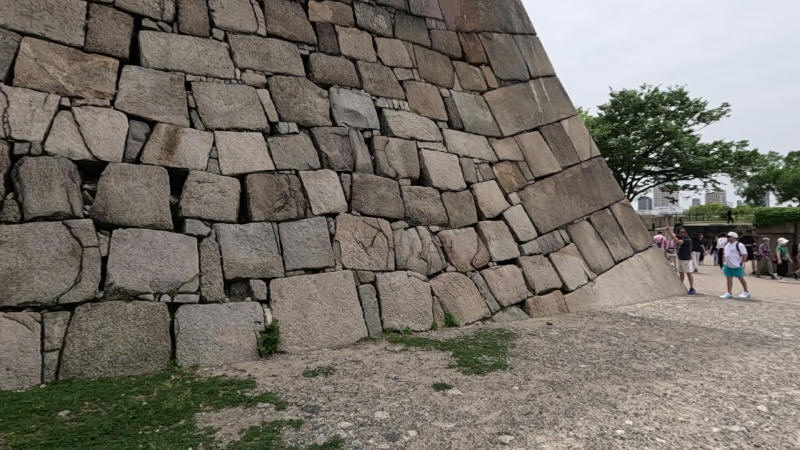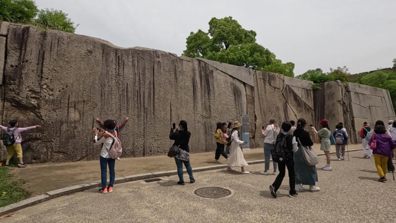 | 一路大坂城へ向かって歩く。天守閣への入館は長蛇の列を作っていた。時間が無かったので、目の前の残念石を眺めて周辺を散策し始める。天守閣の裏手に回ると、米軍の爆撃で被害を受けた石垣があった。気のせいか黒く変色しているように見える。 |