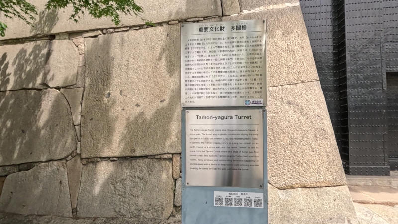 Tamon-yagura Turret stands atop Ote-guchi-masugata Square's stone walls. The turret was originally constructed during the early Edo period in 1628, lost in fire in 1783, and reconstructed in 1848. In general, the Tamon-yagura refers to a long turret built on an earth mound or a stone wall, and the name "Tamon" is said to come from the Tamon Castle where this style of turret was first constructed. This specific Tamon-yagura Turret had spacious rooms, many windows, and outstanding defensive capability -- it was equipped with a device to drop spears right onto any enemies invading the castle through the gate just below the turret. |