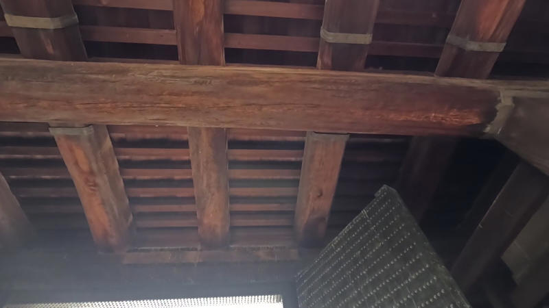 The Otemon Gate is located at the front entrance of Osaka Castle. The gate was built during the early Edo period in 1628, in Koraimon style with a large roof laid atop the front two pillars and smaller roofs supported by the front and rear pillars on both sides. The bottom part of the pillars was repaired and reinforced by the traditional technique of removing the damaged areas and filling the cavities by joining new pieces of wood. Especially, the joint on the rear pillar on the observers' right side is so elaborate that it seems impossible at first glance. |