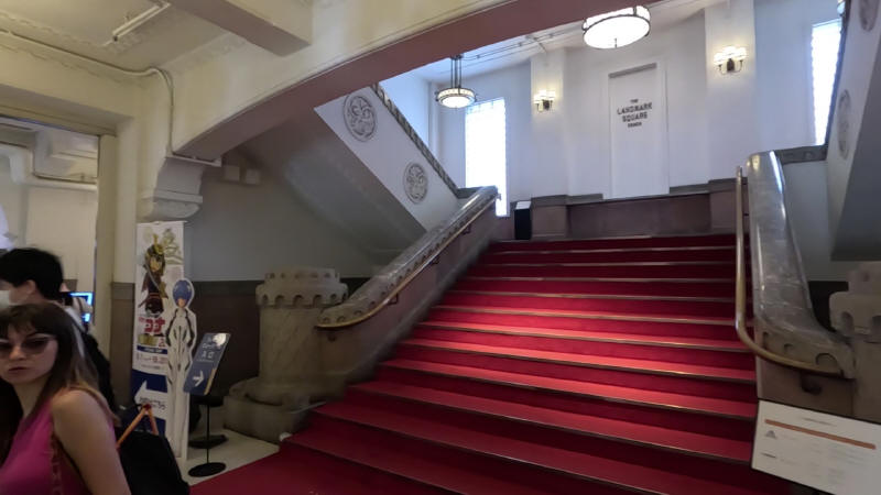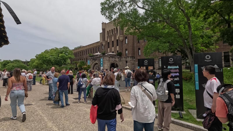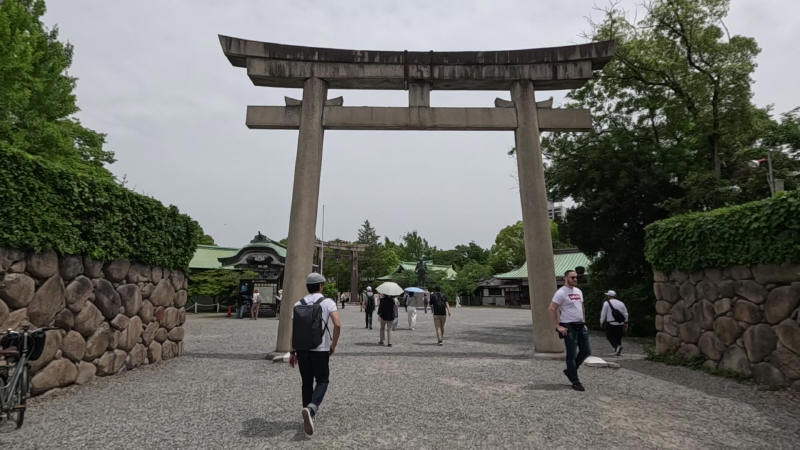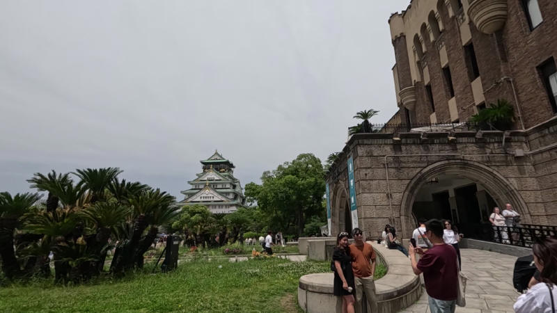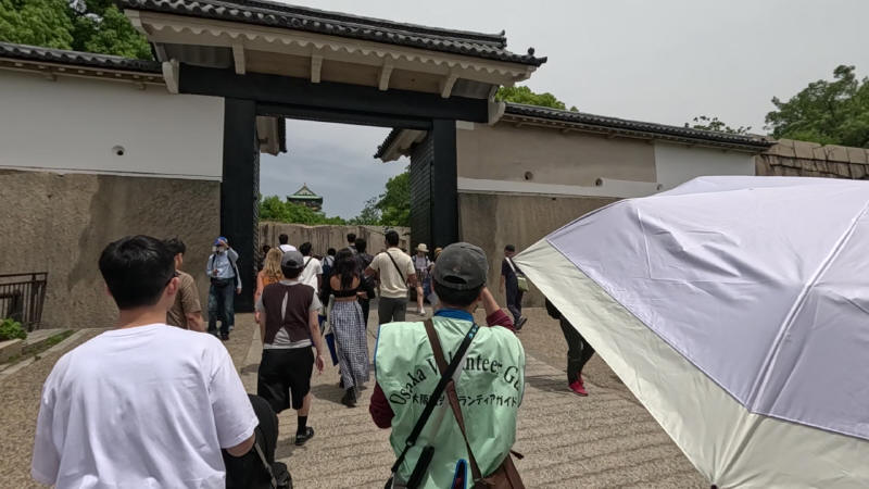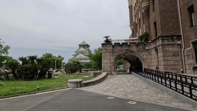 | 「ミライザ大阪城」の中を覗くと階段の手摺が見え、それは北大の農学部とそっくりだった。この建物は1931(昭和6)年に陸軍第四師団司令部庁舎として建てられたようだ。北大は1935(昭和10)年なので同年代の匂いがする。玄関ポーチから天守閣を眺め、いよいよ大坂城へと足を運ぶ。 |