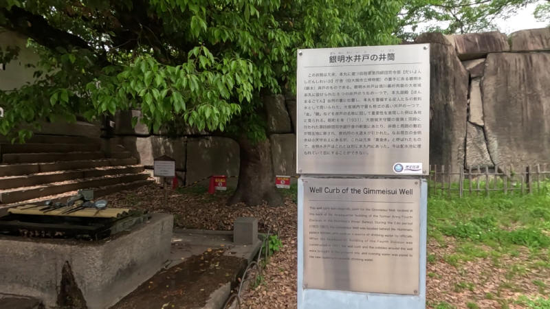 この井筒は元来、本丸に建つ旧陸軍第四司令部庁舎【だいよん しだんしれいぶ】庁舎(旧大阪市立博物館)の裏手にある銀明水 (銀水)井戸のものである。銀明水井戸は徳川幕府再築の大坂城 本丸に設けられた5つの井戸のうちの一つで、本丸御殿【ほん まるごてん】台所の裏に位置し、本丸を警備する役人たちの飲料 水として用いられた。大坂城内で最も格式の高い井戸の一つで、 「金」「銀」などを井戸の名称に冠して重要性を表現した例は各地 に見られる。昭和6年(1931)、大坂城天守閣の復興と同時に 行われた第四師団司令部庁舎の新築にあたり、井筒と周囲の敷石 が現在地に移され、飲料水の水道が引かれた。なお現在の金明 水は小天守台上にもあるが、これは元来「黄金水」とよばれたもの で、金明水井戸はこれとは別に本丸内にあった。今は配水池に埋 もれていて目にすることはできない。 歴史街道ロゴ