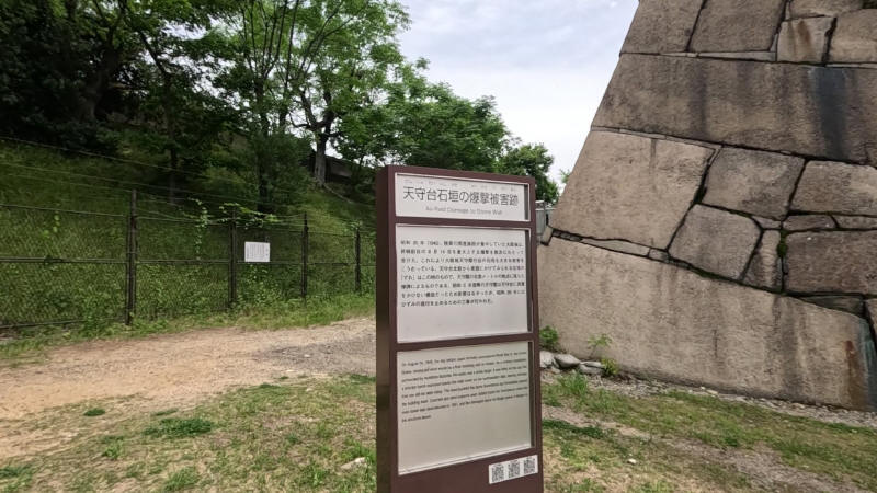 United States conducted what would be a final bombing raid on Osaka.As a military installation surronded by munitions factories,the castle was a prime target.Itwas likely on this day that a one-ton bomb exploded beside the main tower on the northeastem side,leaving damage that can still be seen today.Theblast buckled the stone foundations but fortunately spared the building itself.Concete and steel supports were added inside the foundations when the main tower was reconstructed in 1931,and the damaged stone on longer poses a danger to the structure above. |