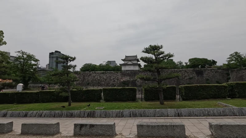 | 南外堀越しにミライザ大阪城を見ながら出発する。南外堀沿いに桜田門前や玉造定番屋跡を通過し、や蓮如上人袈裟懸けの松手前から右に曲がり庭園沿いを走る。 |